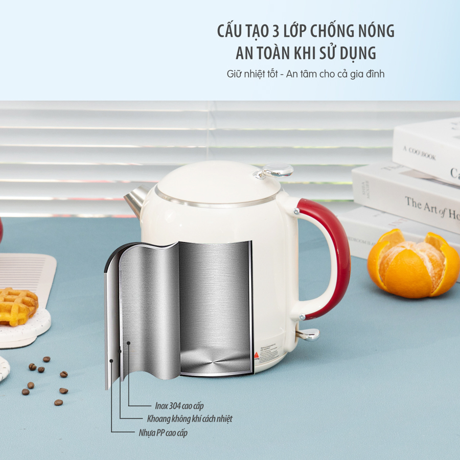 Với cấu tạo này, thân ấm luôn mát khi chạm vào dù nước bên trong đang sôi, bảo vệ người dùng, đặc biệt an toàn khi trong nhà có trẻ nhỏ hoặc người cao tuổi.