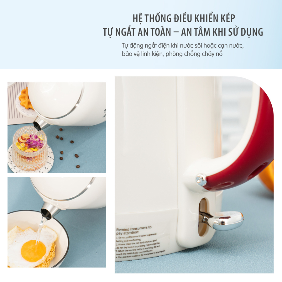 Cơ chế này có tác dụng chống cháy nổ, bảo vệ linh kiện và kéo dài tuổi thọ sản phẩm. Bạn có thể yên tâm sử dụng mà không cần lo lắng quên tắt ấm sau khi đun.