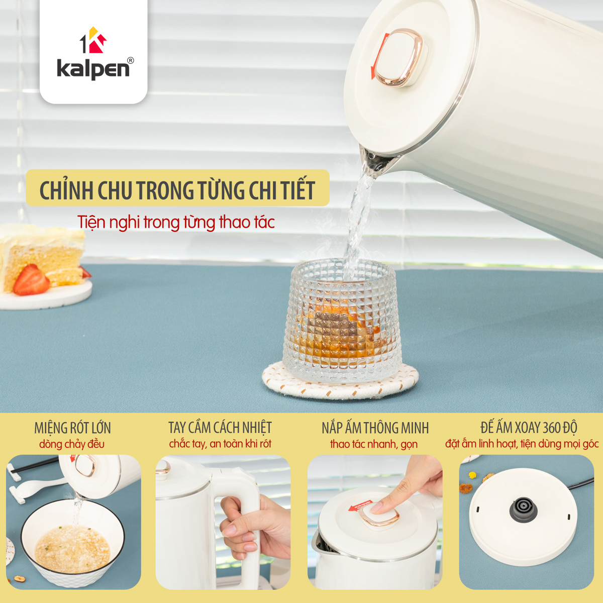 Đế ấm được thiết kế xoay 360 độ, mang lại sự tiện lợi và dễ dàng khi sử dụng.