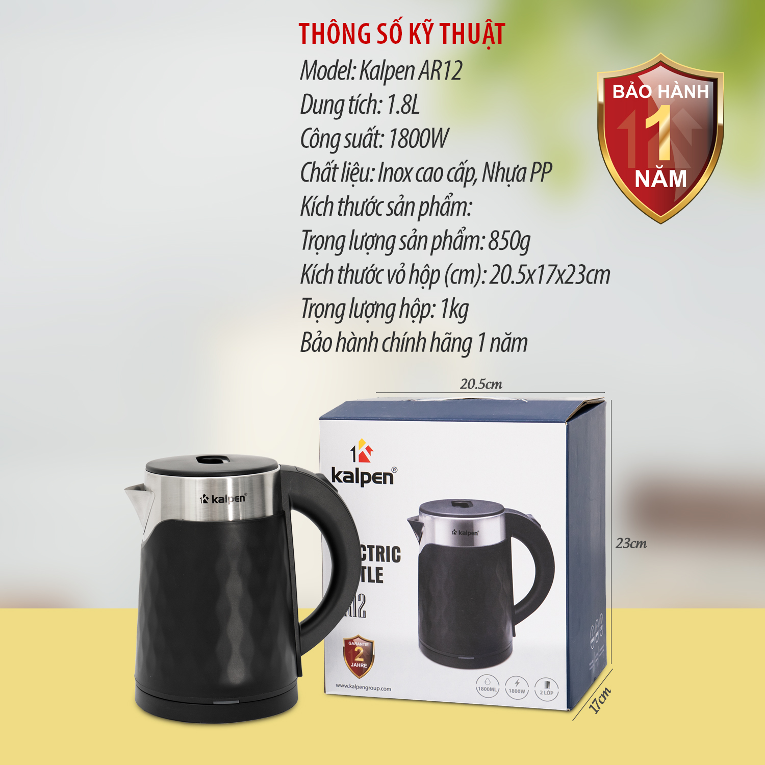 Kalpen AR12 là ấm đun nước dung tích lớn 1.8L, phù hợp nhu cầu gia đình và văn phòng.