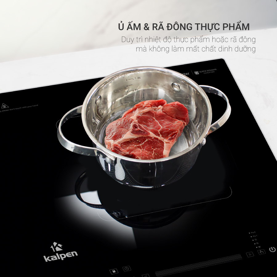 Warm Keeping & Defrost Function giúp bếp từ đôi Kalpen duy trì nhiệt độ thực phẩm hoặc rã đông một cách nhẹ nhàng mà không làm mất chất dinh dưỡng, giúp bảo toàn hương vị và giá trị dinh dưỡng của thực phẩm. Ở chế độ này nhiệt độ ủ ấm vào khoản 80 độ C.