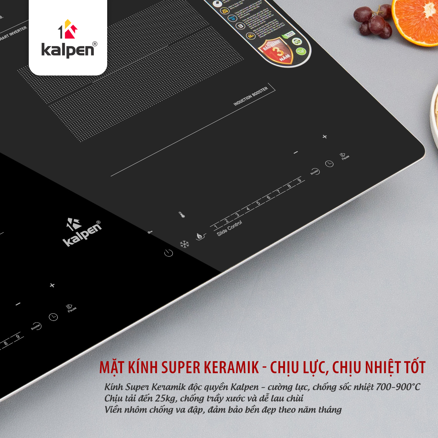 Mặt kính được sản xuất theo công nghệ SUPER KERAMIK của tập đoàn Kalpen, với viền nhôm bao quanh 4 cạnh và cấu tạo từ kính ceramic cường lực, cho khả năng chống sốc nhiệt ở nhiệt độ cao (700–900°C). Chịu lực va đập mạnh, khả năng chịu tải tốt khi đun ở nhiệt độ cao (25 kg).