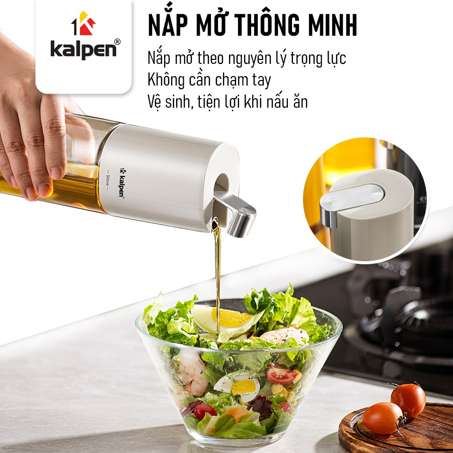 Nắp bình tự động mở khi rót theo nguyên lý trọng lực, không cần thao tác mở tay như các loại bình đựng gia vị thông thường. Thiết kế này giúp việc sử dụng trở nên nhanh chóng, tiện lợi và vệ sinh hơn.