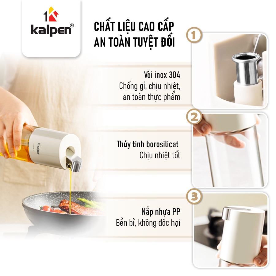 Thân bình sử dụng thủy tinh borosilicate dày dặn, không chứa chì, chịu nhiệt tốt và chống ăn mòn, đảm bảo an toàn tuyệt đối cho các loại dầu và gia vị lỏng.