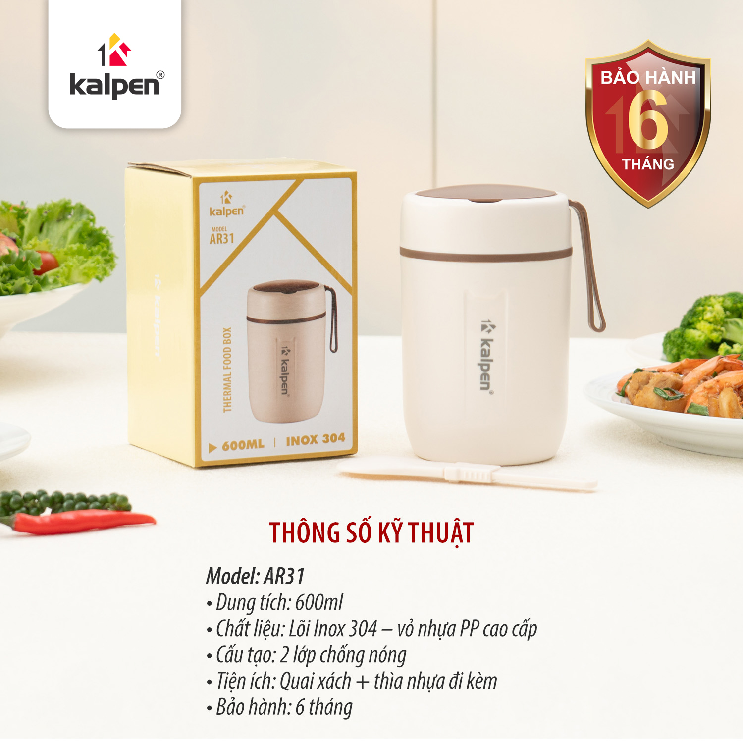 Với dung tích 600 ml, Kalpen AR31 phù hợp cho một khẩu phần ăn cá nhân như cháo, súp, phở hoặc các món ăn nhẹ. Thiết kế nhỏ gọn giúp bình dễ dàng mang theo trong balo hoặc túi xách, đặc biệt tiện lợi cho dân văn phòng, học sinh, sinh viên hoặc mẹ bỉm sữa chuẩn bị bữa ăn cho bé.