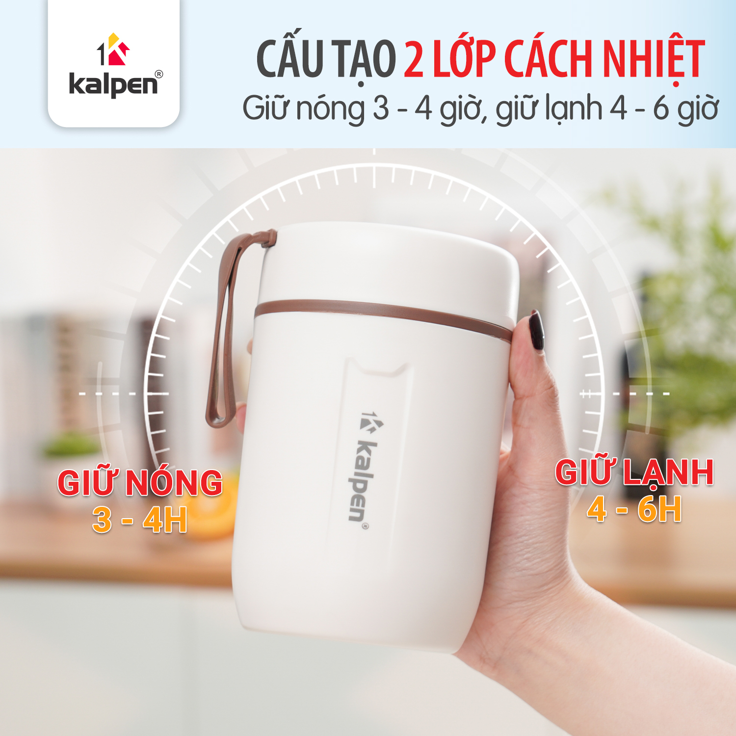 Bình đựng thức ăn Kalpen AR31 được thiết kế với cấu tạo 2 lớp gồm lớp trong Inox 304 và lớp vỏ ngoài nhựa PP nguyên sinh. Cấu trúc này giúp tăng khả năng cách nhiệt, giữ thức ăn ấm khoảng 3–4 giờ và giữ lạnh từ 4–6 giờ. Nhờ đó, bạn có thể mang theo cháo, súp hoặc các món ăn yêu thích đến văn phòng, trường học mà vẫn đảm bảo chất lượng và hương vị.