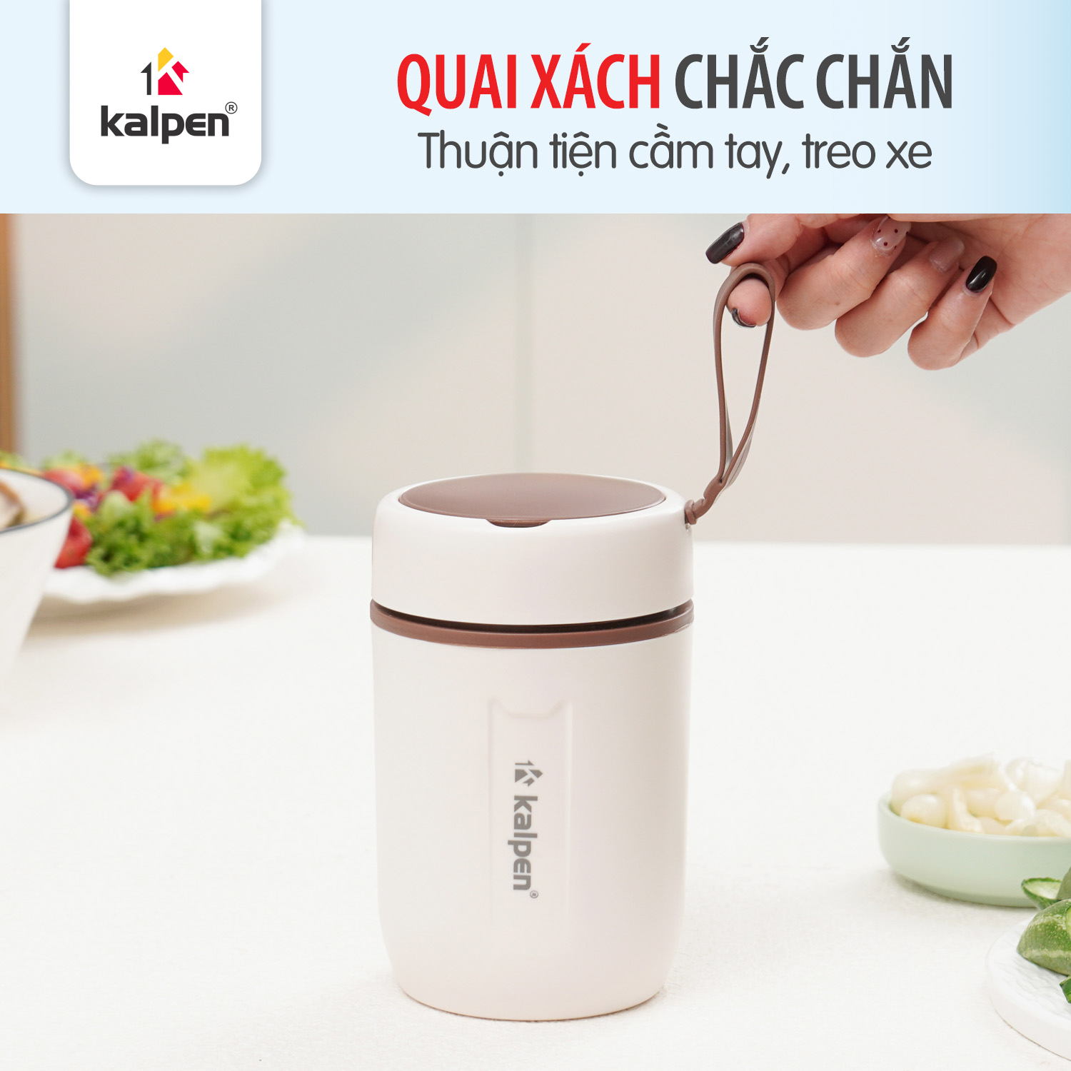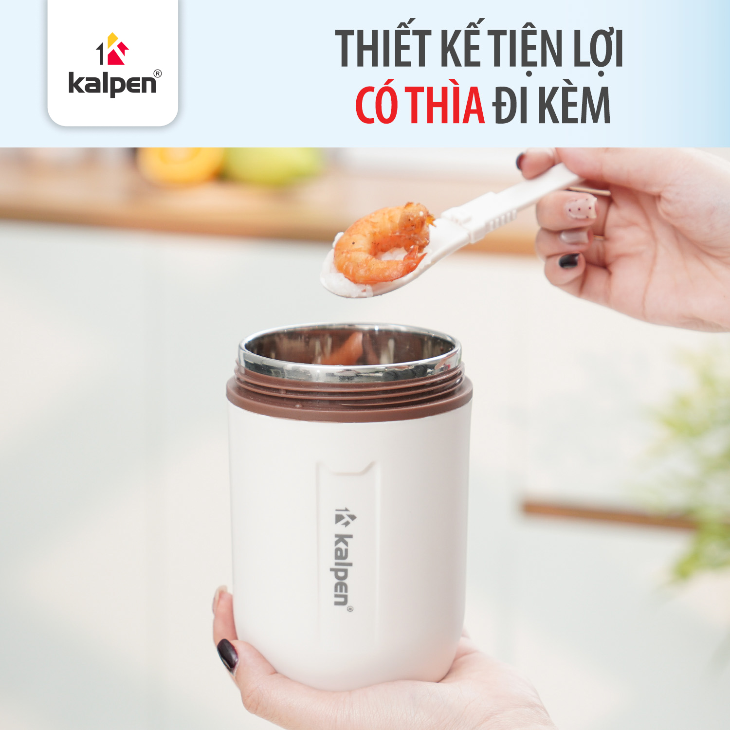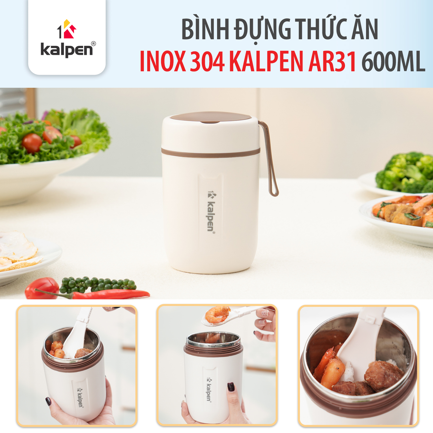 Kalpen AR31 được thiết kế nhằm tối ưu sự tiện dụng trong quá trình sử dụng hằng ngày. Sản phẩm đi kèm thìa nhựa đồng bộ được cất gọn ngay trên nắp bình, giúp đảm bảo vệ sinh và tránh tình trạng quên mang thìa khi mang theo đồ ăn. Ngoài ra, bình còn được trang bị quai xách chắc chắn bằng silicon hoặc nhựa dẻo, giúp dễ dàng cầm tay, treo xe hoặc mang theo khi di chuyển.