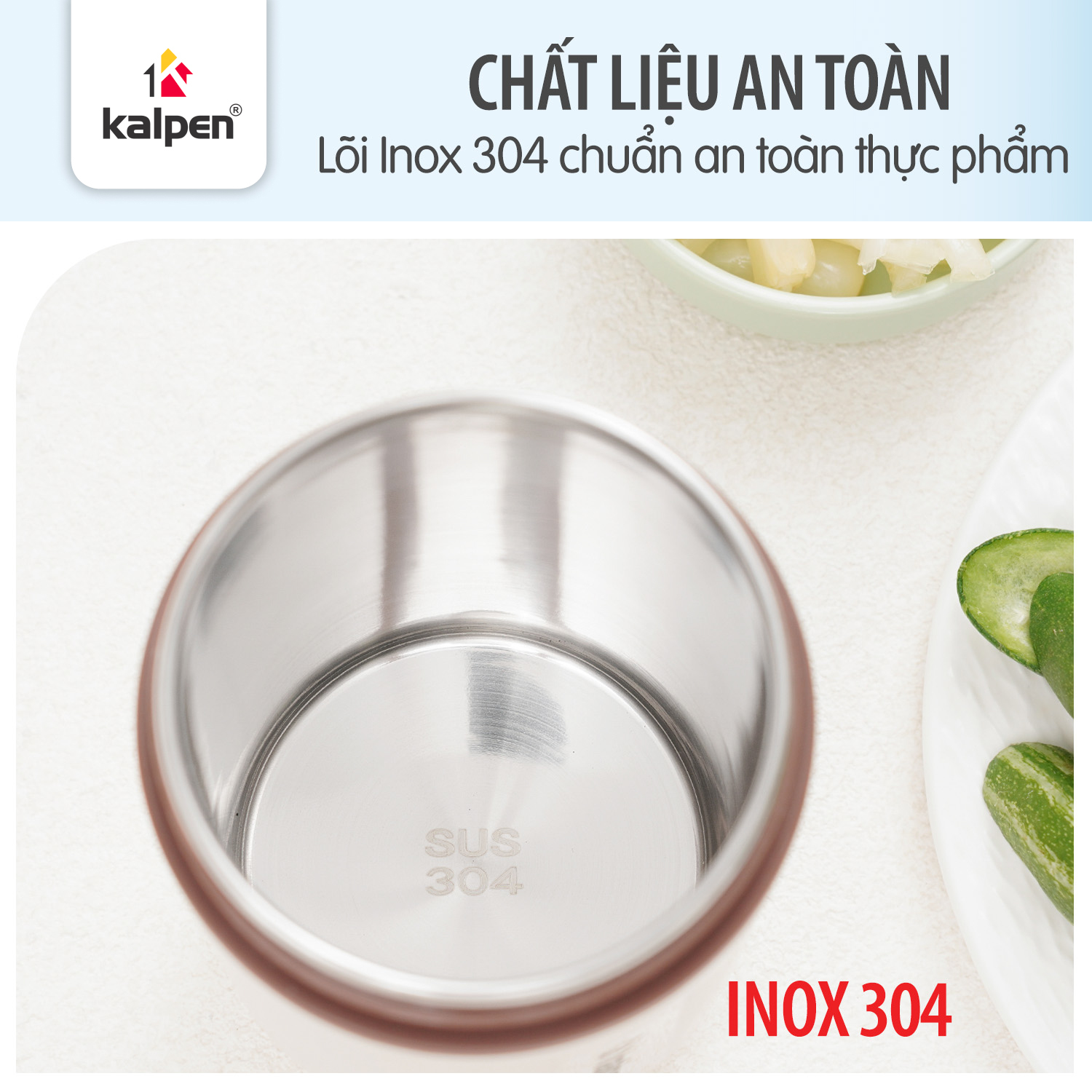 Yếu tố quan trọng nhất khi lựa chọn bình đựng thực phẩm chính là chất liệu. Kalpen AR31 được trang bị lớp lõi Inox 304 cao cấp – loại thép không gỉ được sử dụng phổ biến trong ngành thực phẩm nhờ độ an toàn cao. Inox 304 không bị oxy hóa, không phản ứng hóa học với thực phẩm dù ở nhiệt độ cao hay khi chứa các món ăn có tính axit như canh chua hoặc nước hoa quả. Nhờ đó, món ăn luôn giữ được hương vị tự nhiên và không thôi nhiễm chất độc hại.
