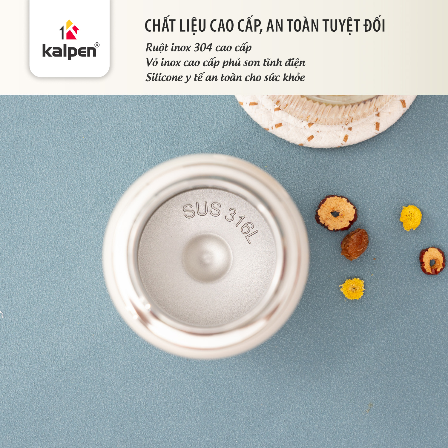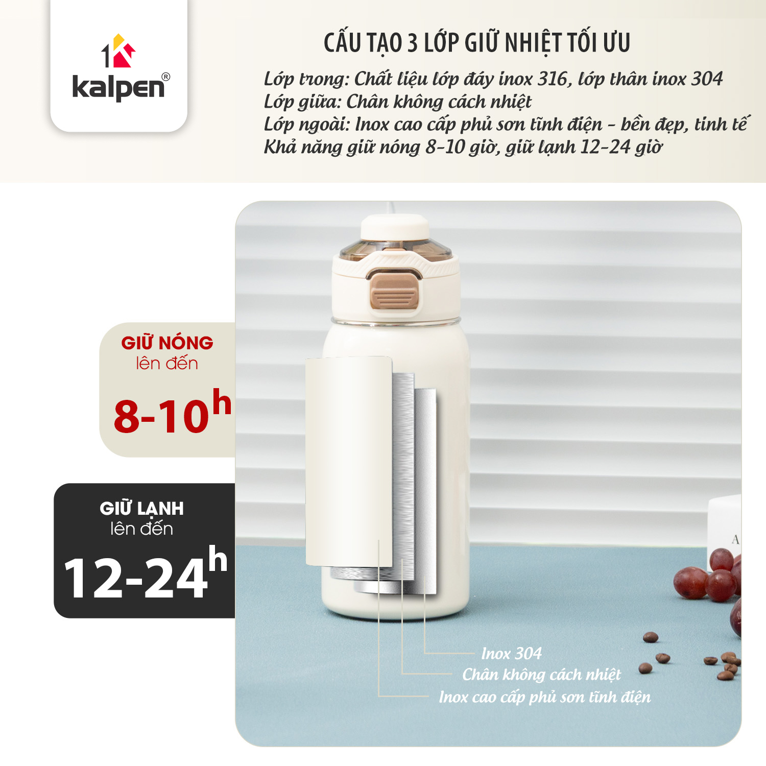Bình giữ nhiệt Kalpen DA10 sở hữu cấu trúc 3 lớp gồm Inox 304 bên trong, lớp chân không cách nhiệt ở giữa và Inox 201 phủ sơn tĩnh điện bên ngoài. Thiết kế này giúp đồ uống nóng giữ ấm từ 6–8 tiếng và đồ uống lạnh giữ mát từ 12–24 tiếng, đồng thời hạn chế tình trạng đọng nước bên ngoài bình.