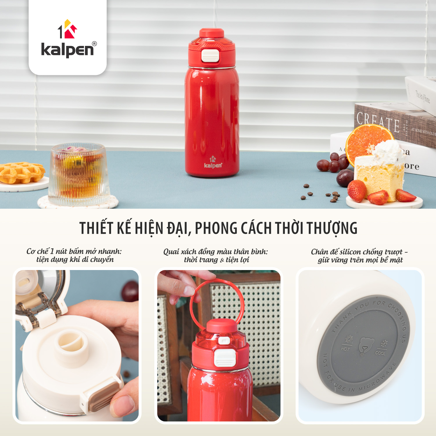 Dung tích 700 ml vừa đủ cho nhu cầu sử dụng hằng ngày. Kiểu dáng thanh thoát, đường nét tối giản kết hợp lớp sơn tĩnh điện bền màu mang lại vẻ ngoài sang trọng, phù hợp với phong cách sống năng động. Sản phẩm có hai tông màu đỏ nổi bật và xanh thanh nhã, phù hợp cho cả nam và nữ.