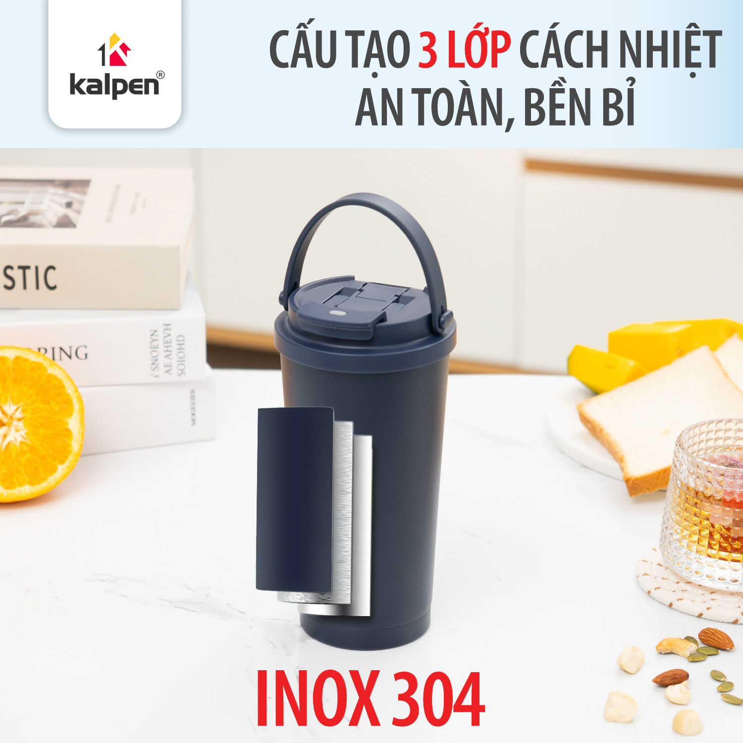 Cốc giữ nhiệt Kalpen AR32 được thiết kế với cấu tạo 3 lớp chắc chắn, tối ưu cả khả năng giữ nhiệt và độ an toàn khi sử dụng. Lớp trong cùng sử dụng Inox 304 cao cấp tiếp xúc trực tiếp với đồ uống. Đây là loại thép không gỉ thường được sử dụng trong ngành thực phẩm và y tế nhờ độ an toàn cao, không phản ứng với đồ uống nóng hoặc lạnh và không chứa chất độc hại. Nhờ đó, đồ uống luôn giữ được hương vị tự nhiên và đảm bảo an toàn cho sức khỏe trong quá trình sử dụng lâu dài.