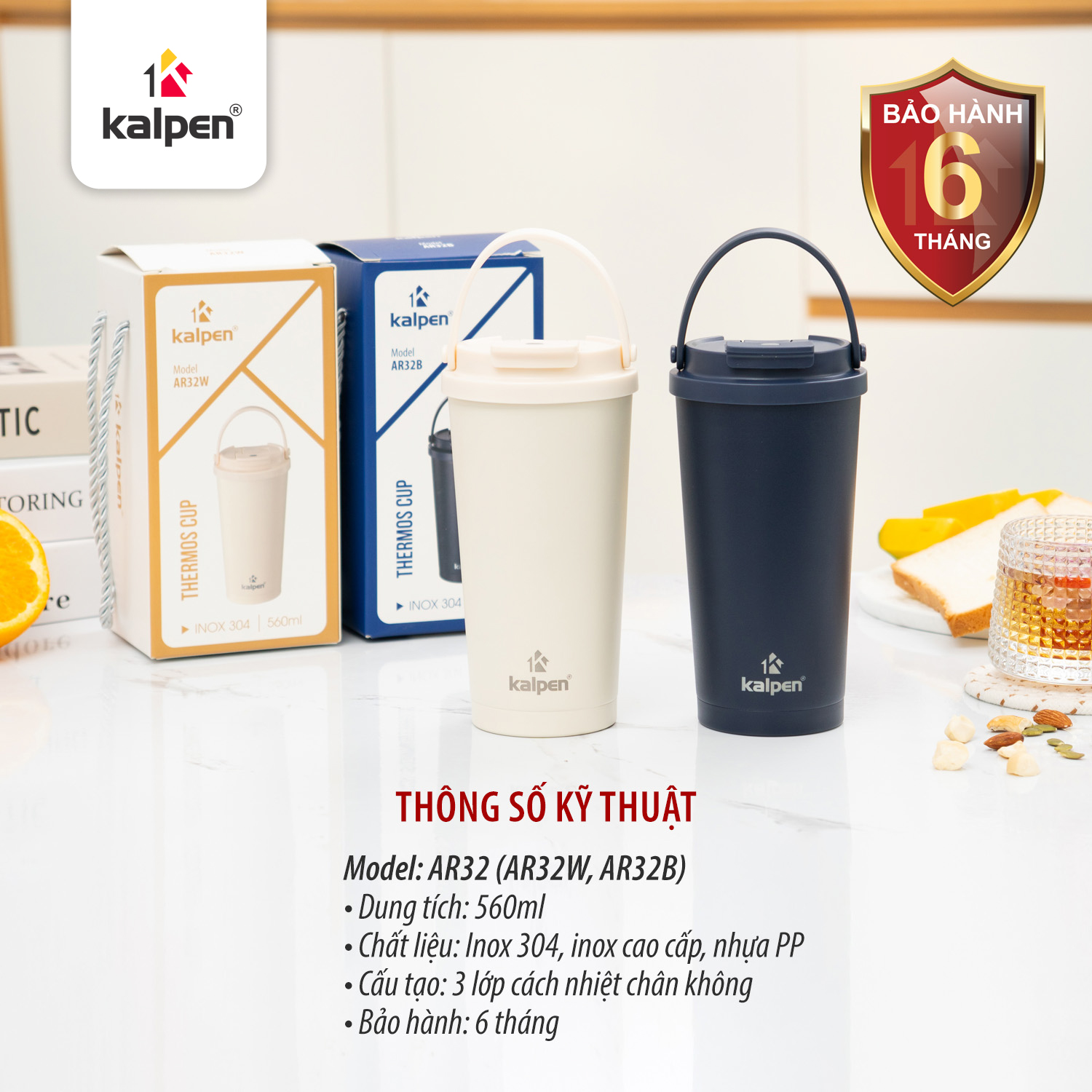 Cốc giữ nhiệt Kalpen AR32 có dung tích 560 ml – phù hợp cho nhu cầu sử dụng hằng ngày như uống nước, cà phê, trà hoặc các loại đồ uống yêu thích. Kiểu dáng nhỏ gọn, hiện đại giúp dễ dàng mang theo khi đi làm, đi học, du lịch hoặc dã ngoại.