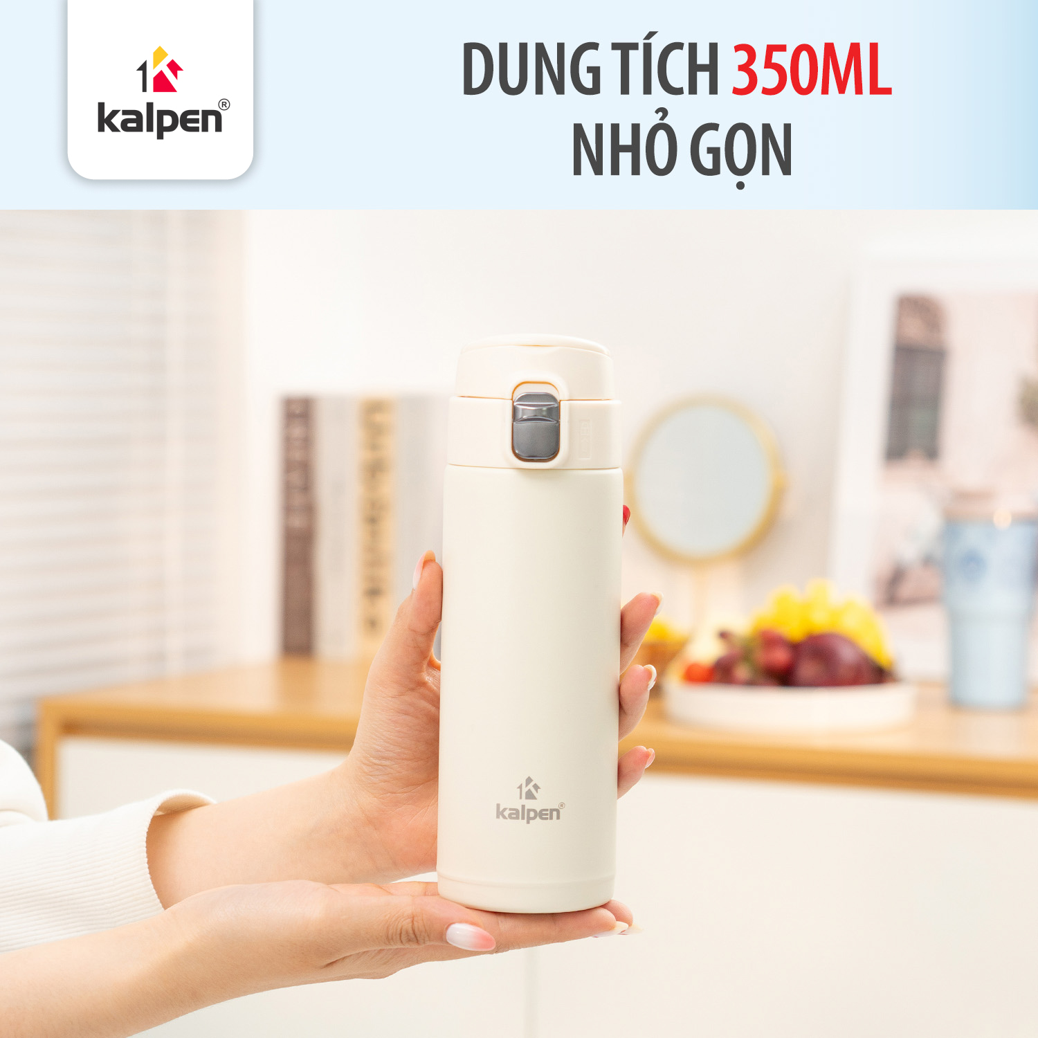 Với dung tích 350 ml, Kalpen AR33W có kích thước nhỏ gọn, vừa đủ cho nhu cầu sử dụng cá nhân như cà phê, trà hoặc nước ấm cho buổi sáng làm việc và học tập. Thiết kế dung tích hợp lý giúp bình nhẹ, dễ cầm nắm và dễ dàng đặt trong balo hoặc túi xách khi di chuyển.
