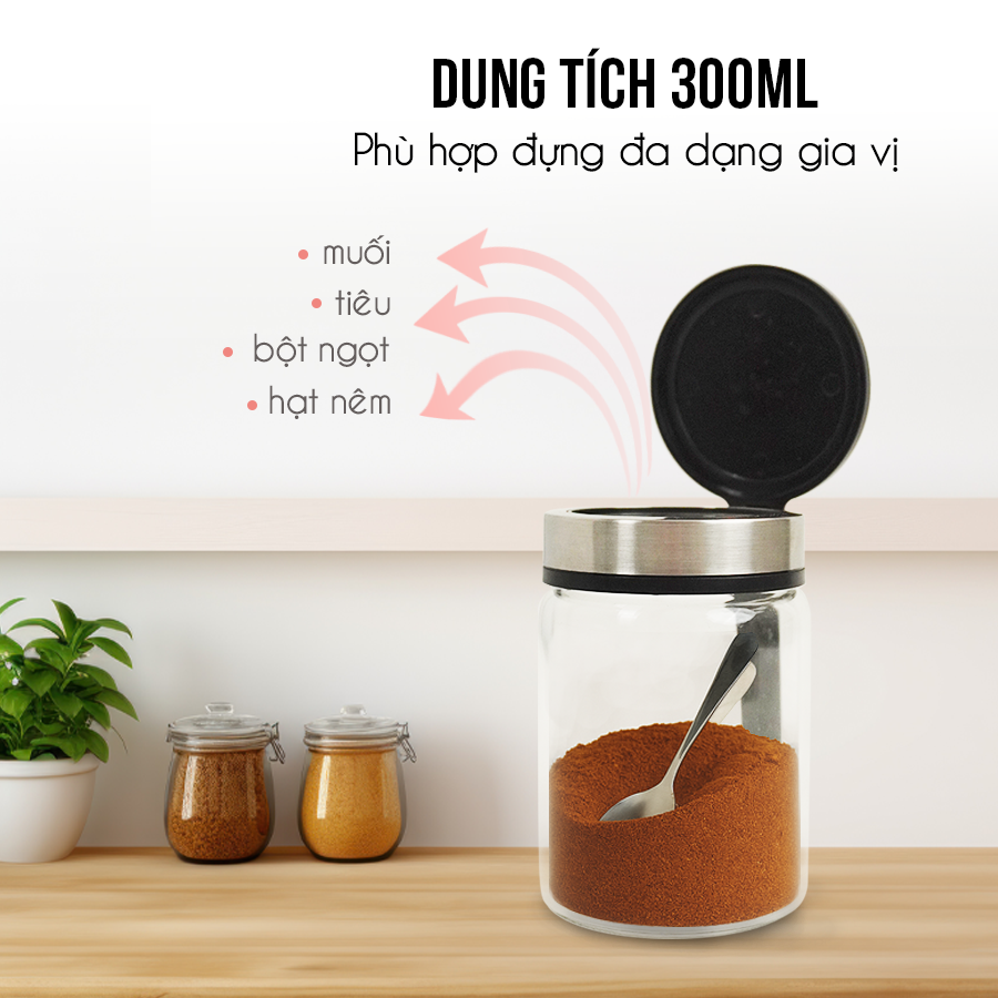 Dung tích 300ml/hộp phù hợp đựng các loại gia vị phổ biến như muối, tiêu, bột ngọt, đường, hạt nêm, ớt khô...