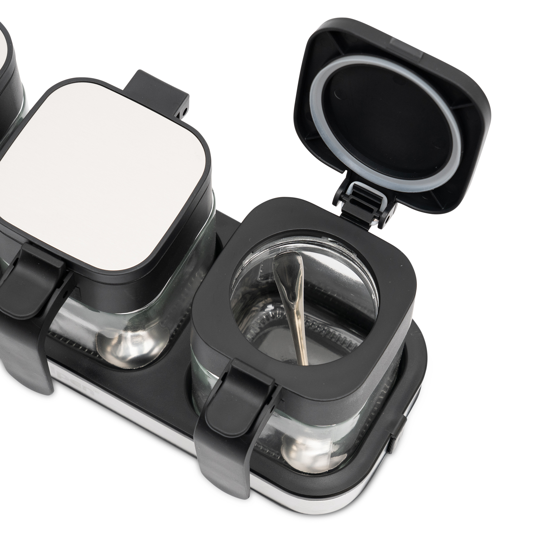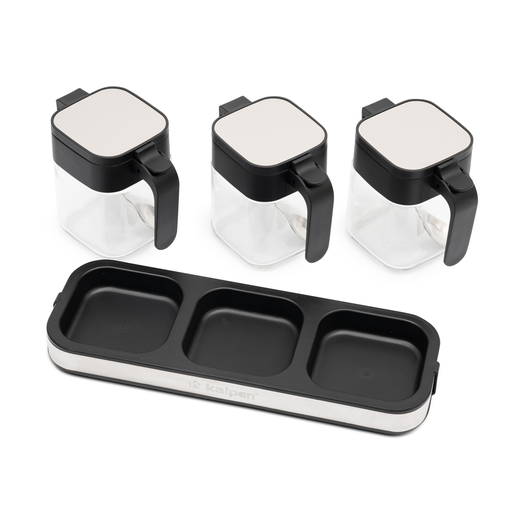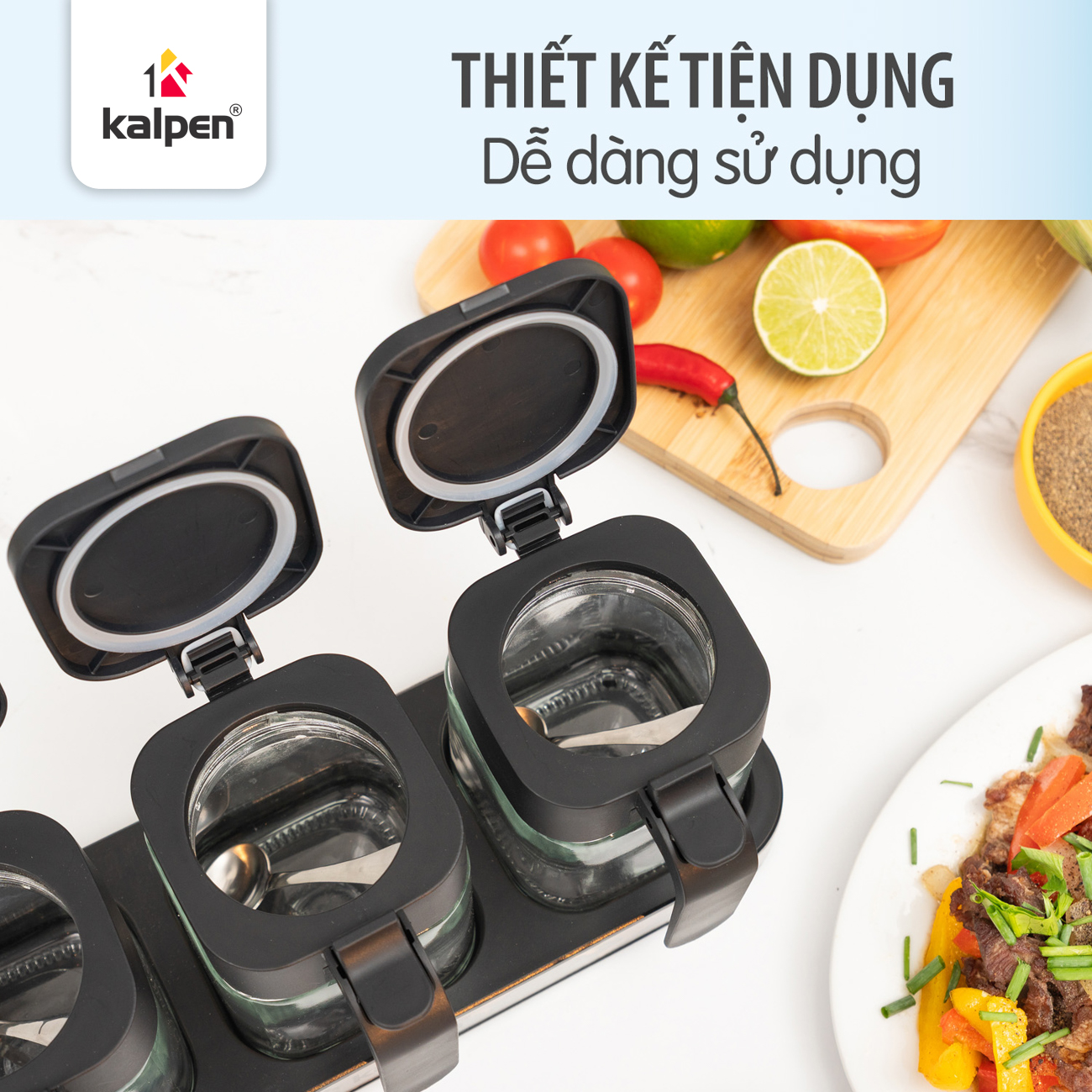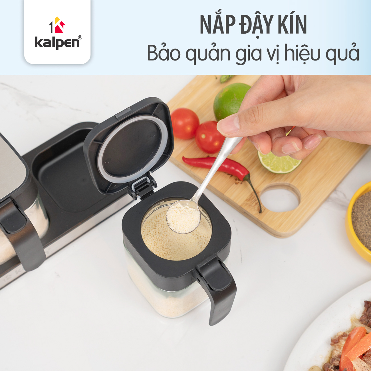 Mỗi hộp gia vị Kalpen SB3 được trang bị muỗng đong inox đi kèm, giúp lấy gia vị thuận tiện và hạn chế bám dính. Tay cầm chắc chắn hỗ trợ người dùng thao tác mở nắp nhẹ nhàng, nhanh chóng, thuận tiện trong quá trình nấu nướng hằng ngày.