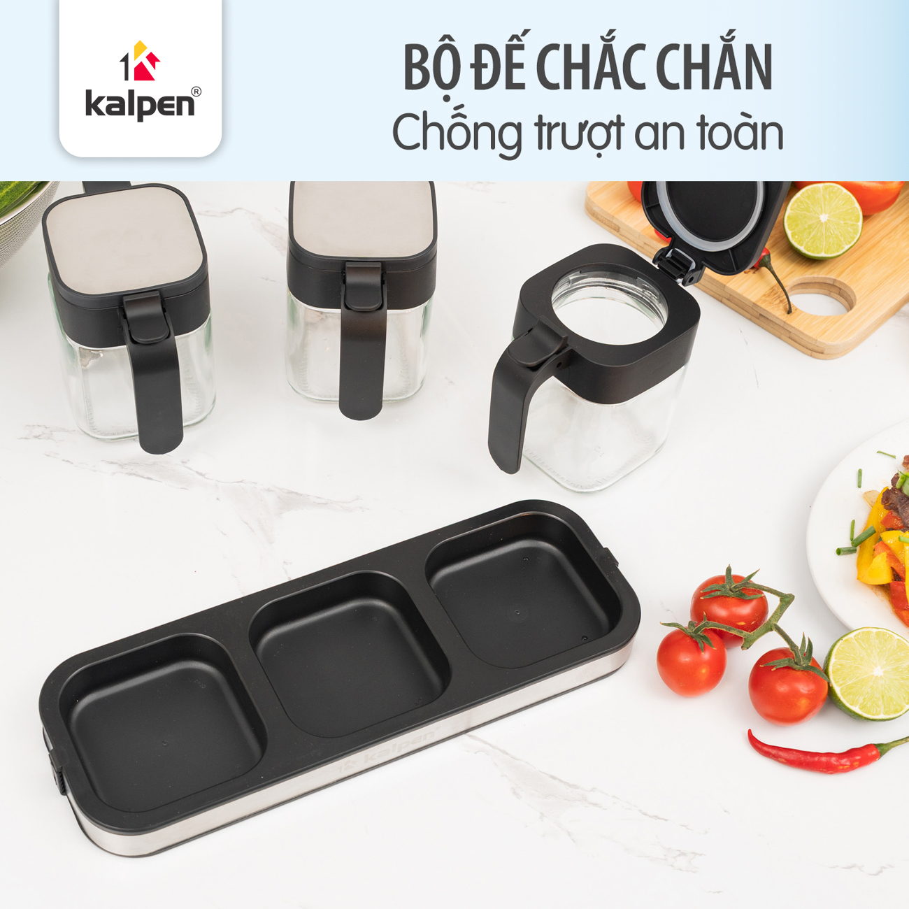 Bộ đế Kalpen SB3 được làm từ nhựa PP cao cấp bọc viền inox bền đẹp, giúp cố định các hộp gia vị gọn gàng, hạn chế rơi đổ hay trơn trượt trên mặt bếp. Thiết kế vừa vặn giúp bạn dễ dàng sắp xếp trên bàn bếp hoặc kệ gia vị.