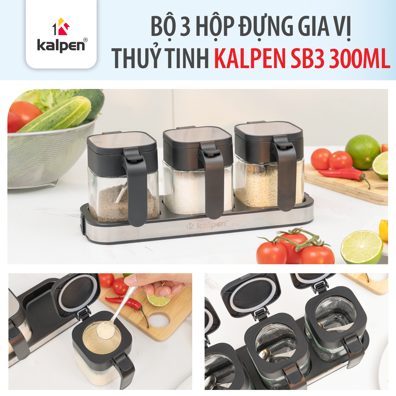 Với dung tích 300 ml mỗi hộp, Kalpen SB3 phù hợp đựng nhiều loại gia vị như muối, tiêu, đường, bột ngọt, hạt nêm, ớt khô…, giúp căn bếp trở nên ngăn nắp, khoa học và tăng tính thẩm mỹ.