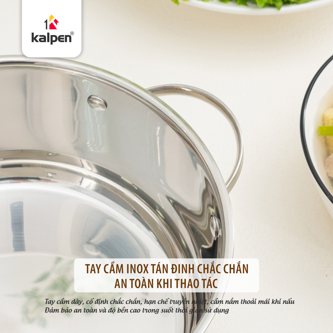 Tay cầm bằng Inox dày, đinh tán cố định chắc chắn, không lỏng lẻo, không nóng tay khi sử dụng, đảm bảo độ bền và an toàn trong suốt quá trình nấu nướng.