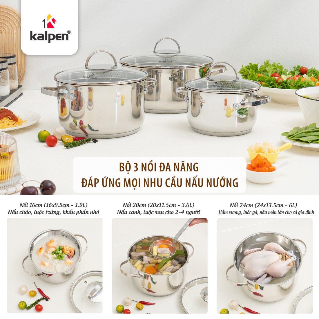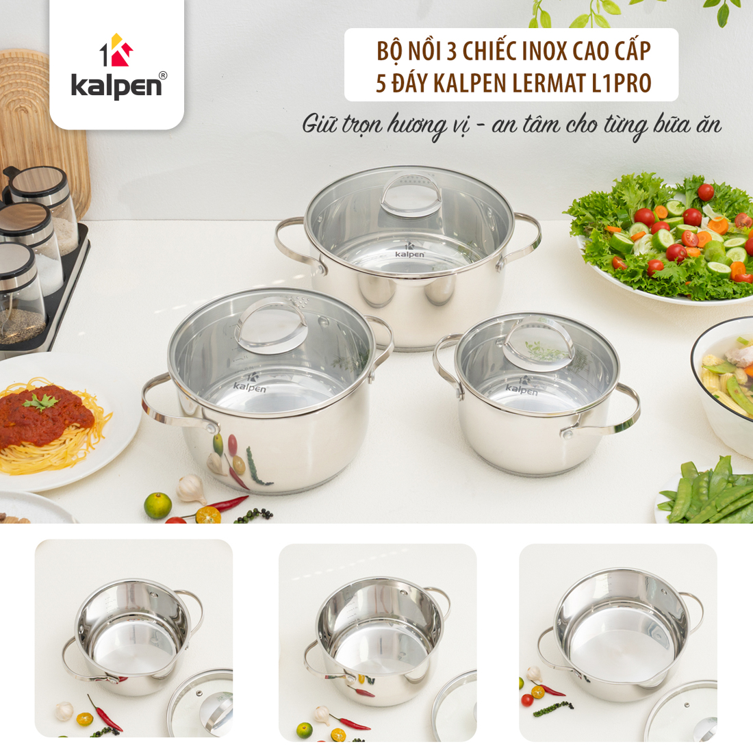 Video giới thiệu bộ 3 nồi Inox 5 lớp đáy Kalpen Lermat L1Pro 16-20-24 cm