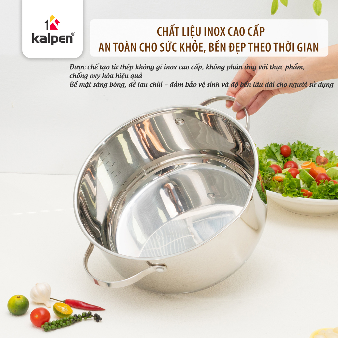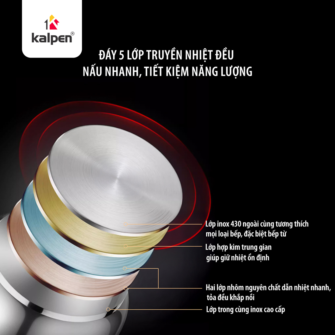 • Inox 430 ngoài cùng – bắt từ tốt, dùng được trên mọi loại bếp, đặc biệt là bếp từ.