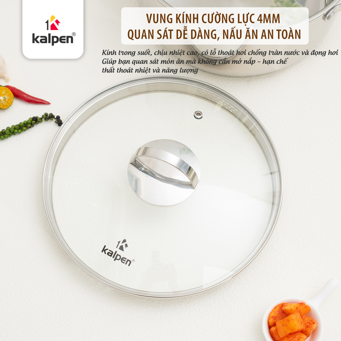 Trang bị vung kính trong suốt dày 4 mm, có lỗ thoát hơi chống đọng nước, giúp người dùng dễ dàng theo dõi món ăn trong quá trình nấu mà không cần mở nắp.