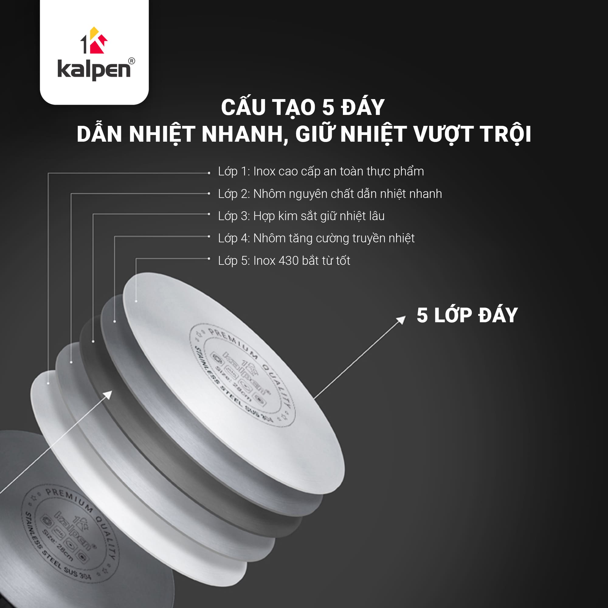 • Lớp ngoài cùng: Inox 430 – Giúp nồi bắt từ tốt, sử dụng hiệu quả trên bếp từ và các loại bếp khác.
