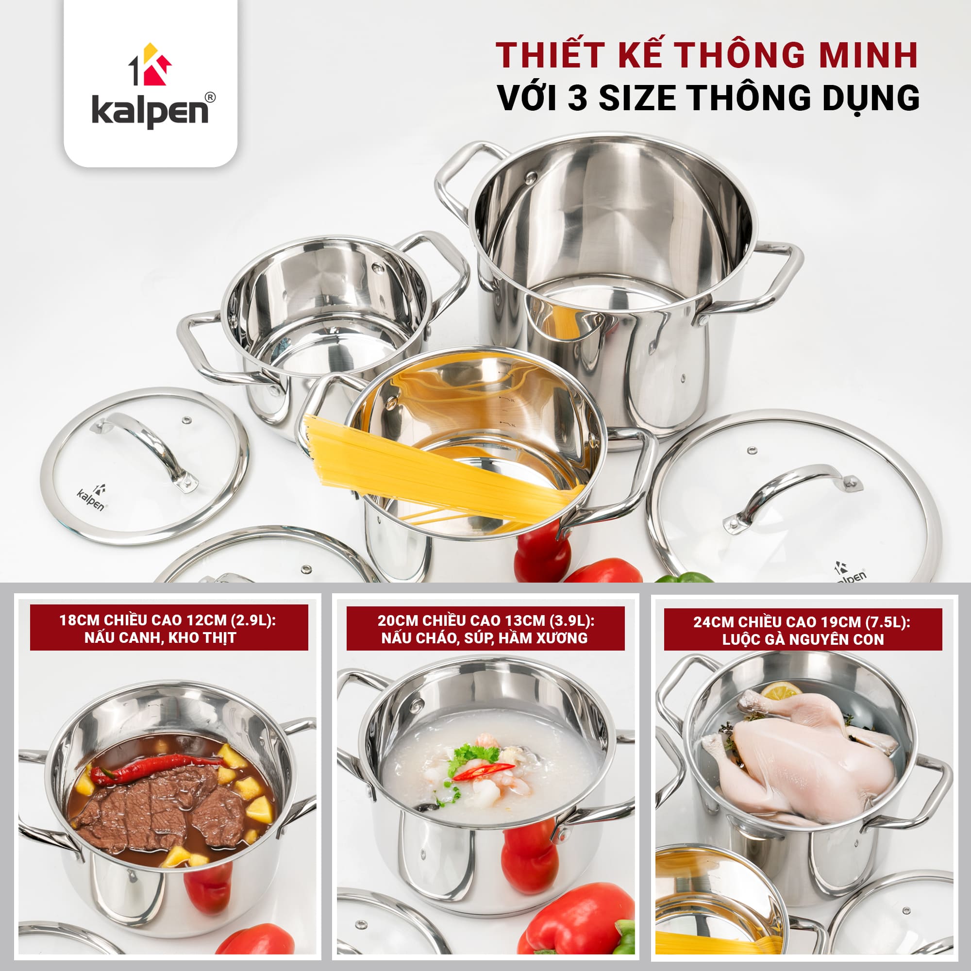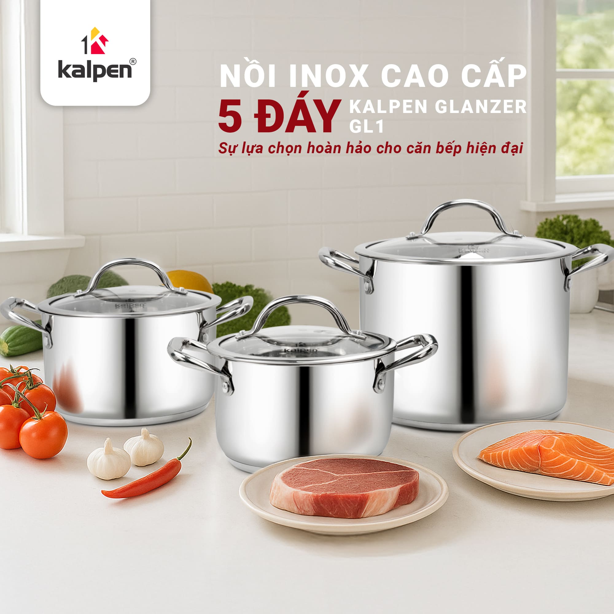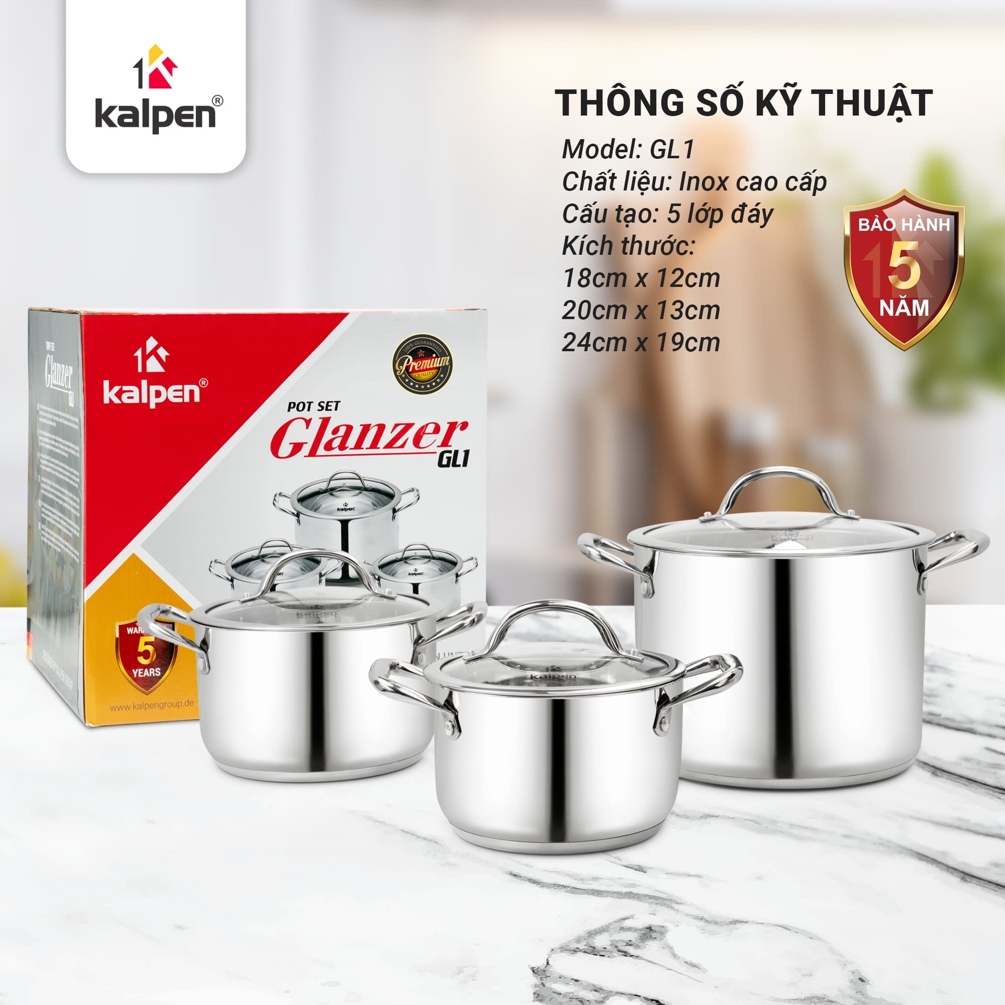 Video giới thiệu bộ 3 nồi Inox 5 lớp đáy thành cao Kalpen Glanzer GL1 18-20-24 cm