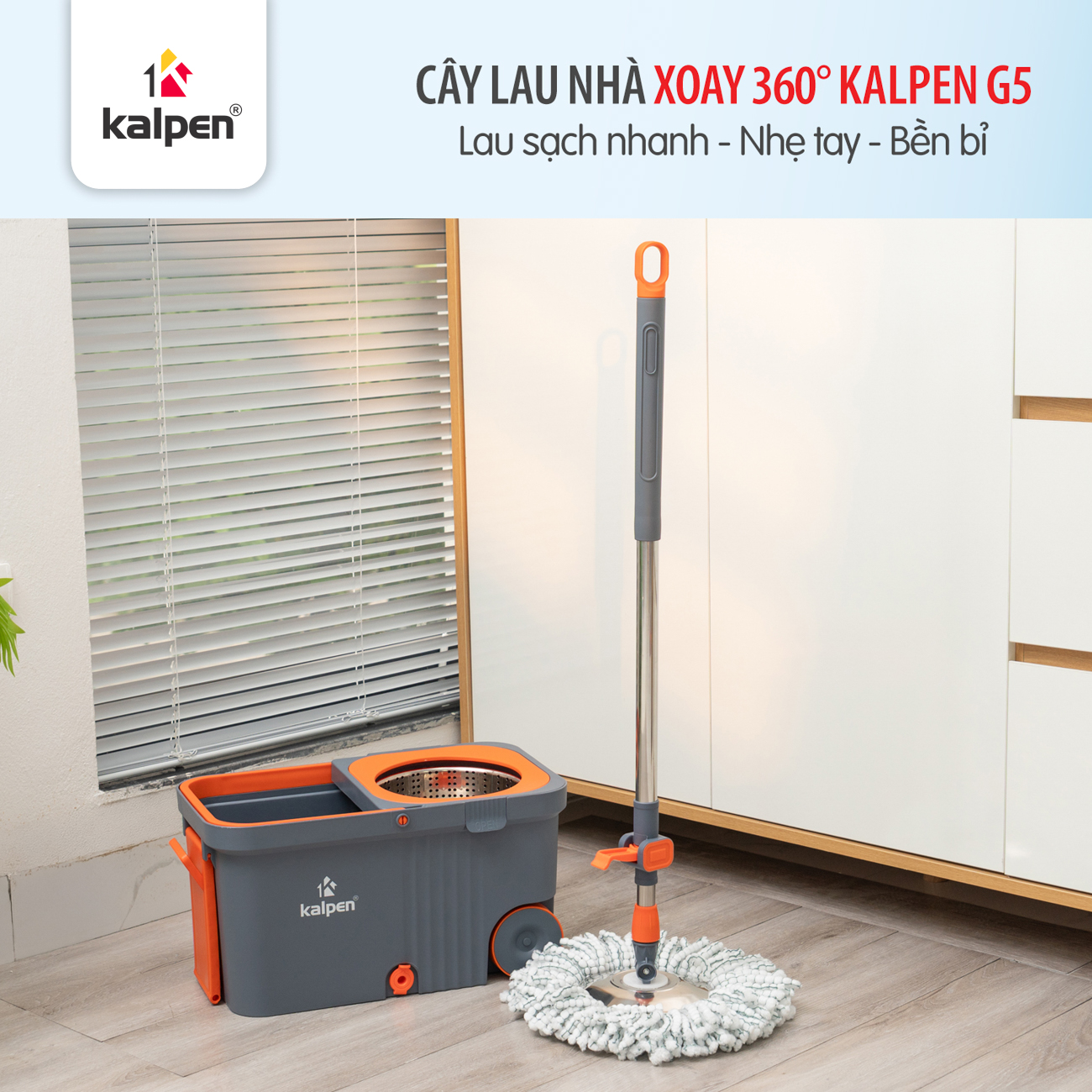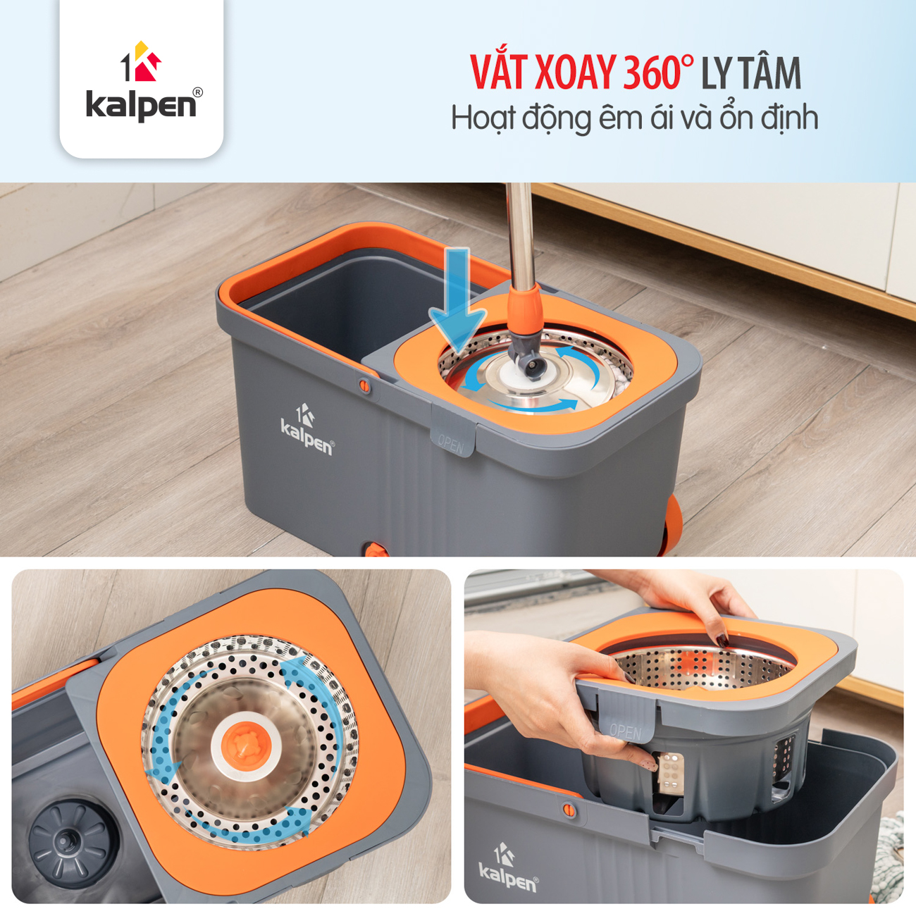 Giỏ vắt Inox chống gỉ sét, bền hơn so với giỏ nhựa thông thường. Cơ chế vắt xoay 360° giúp bông lau được vắt khô nhanh chóng, tiết kiệm thời gian và hạn chế tối đa việc tiếp xúc tay với nước bẩn.