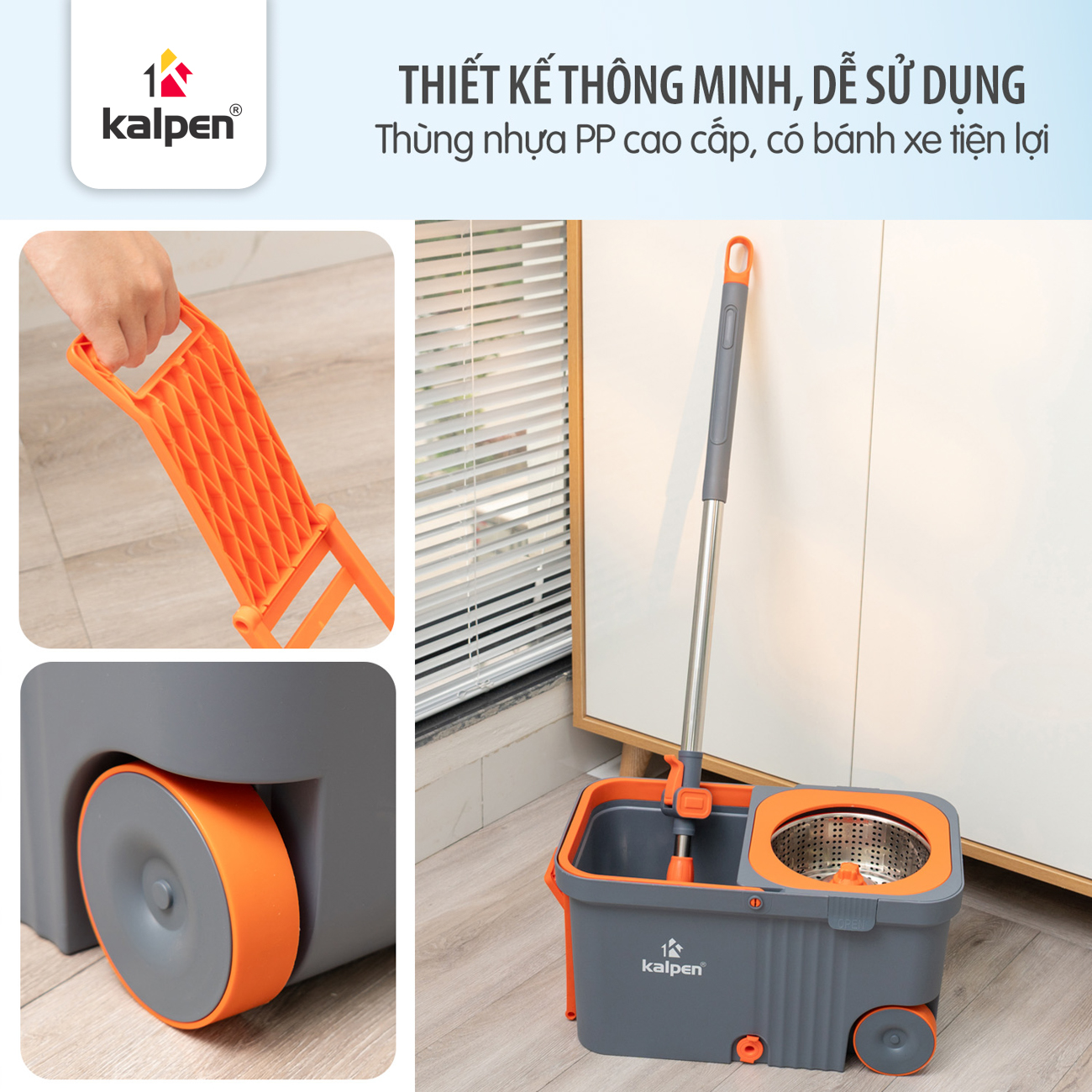 Thùng lau được làm từ nhựa PP cao cấp, chịu lực tốt, bền bỉ trong quá trình sử dụng. Giỏ vắt bằng thép không gỉ giúp tăng độ chắc chắn và an toàn. Kích thước thùng 45×25×24 cm nhỏ gọn, dễ cất giữ. Trang bị tay xách và bánh xe, hỗ trợ di chuyển nhẹ nhàng, không tốn nhiều sức.