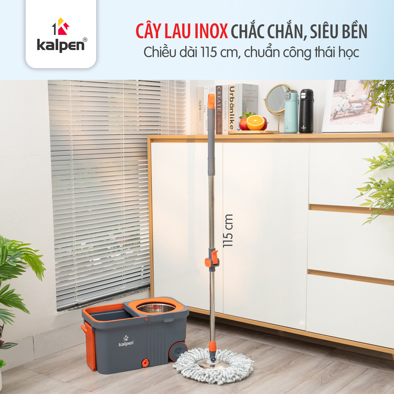 Thân cây lau được làm từ thép không gỉ dày 0.28 mm và 0.26 mm, đường kính 0.25 mm, chịu lực tốt, hạn chế cong vênh. Chiều dài 115 cm phù hợp với vóc dáng người Việt, giúp lau dọn thoải mái mà không cần cúi nhiều, giảm mỏi lưng. Khớp xoay linh hoạt giúp dễ dàng làm sạch các khu vực gầm bàn, gầm giường và góc hẹp.