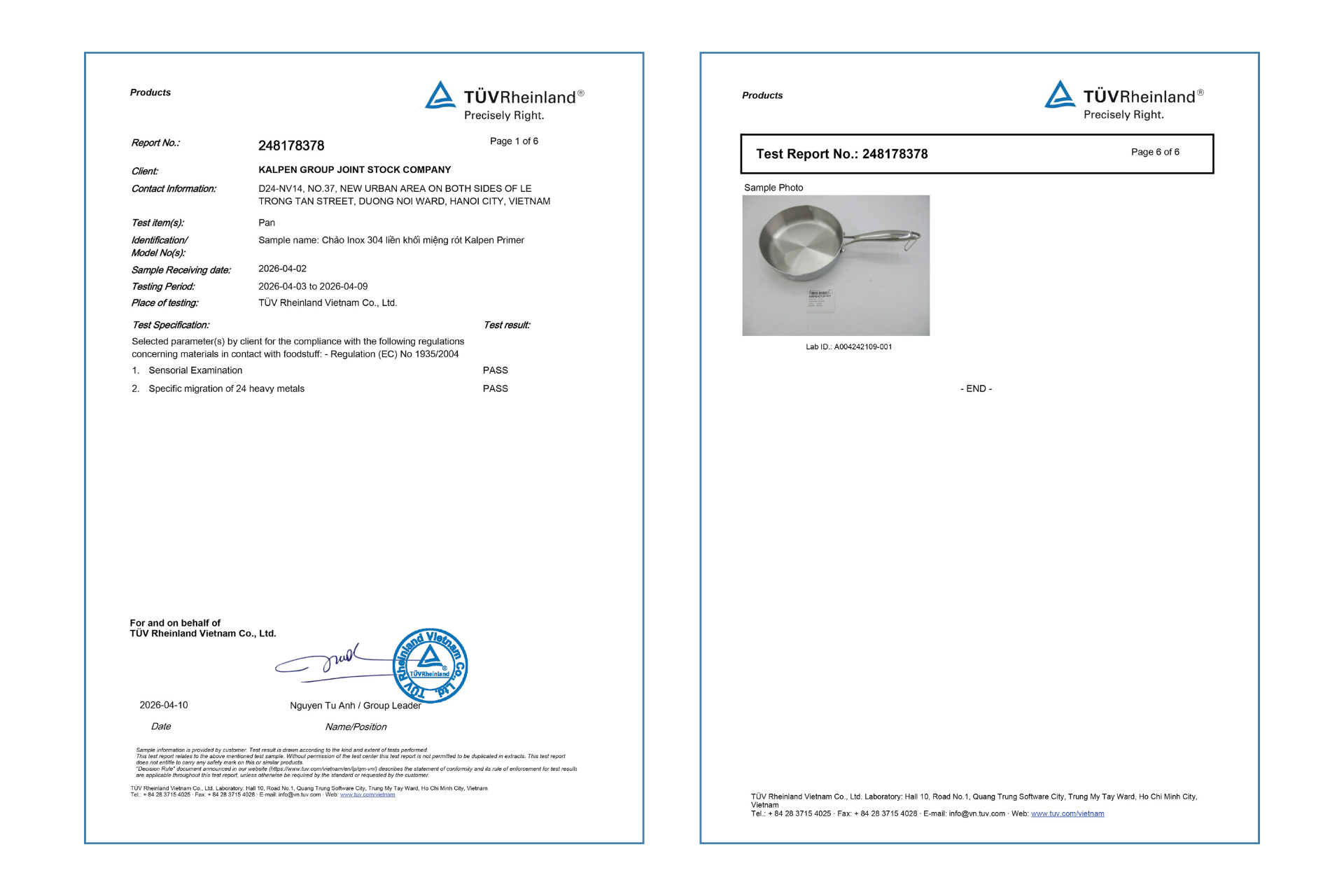 Bộ chảo inox 304 liền khối miệng rót Kalpen Primer tự hào đạt chứng nhận TÜV Rheinland danh giá, khẳng định chất lượng chuẩn Đức và độ an toàn vượt trội. Sản phẩm đáp ứng Quy định (EC) No 1935/2004 của Liên minh Châu Âu về vật liệu tiếp xúc với thực phẩm, đảm bảo: