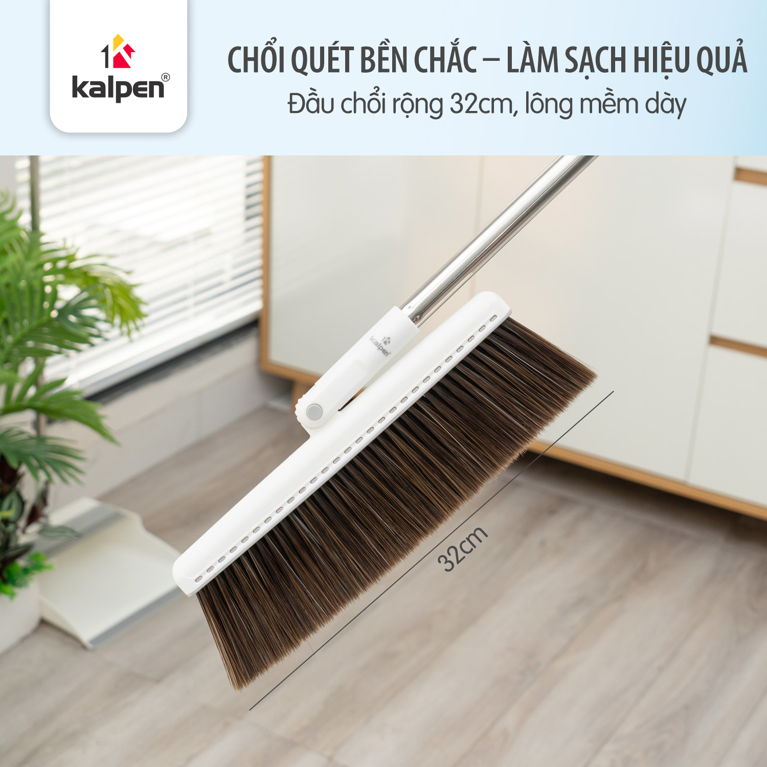 Đầu chổi rộng 32 cm với lông chổi mềm, dày và có độ đàn hồi cao, giúp quét sạch bụi bẩn, tóc và lông thú mà không làm trầy xước bề mặt sàn. Thiết kế xoay 180 ° cho phép dễ dàng làm sạch các khu vực khó tiếp cận như góc tường, gầm bàn, gầm giường.