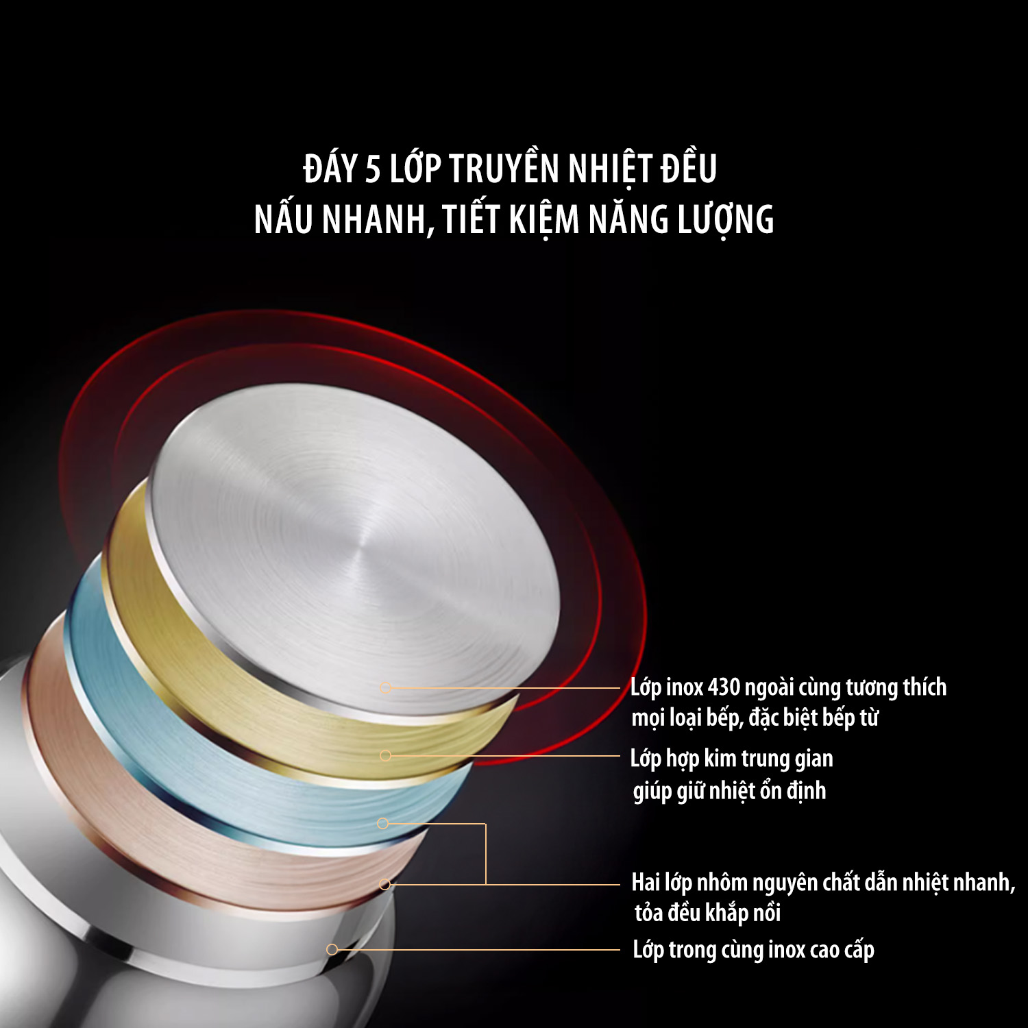 Lớp ngoài cùng inox 430: Bắt từ tốt, dùng được trên mọi loại bếp, đặc biệt là bếp từ.