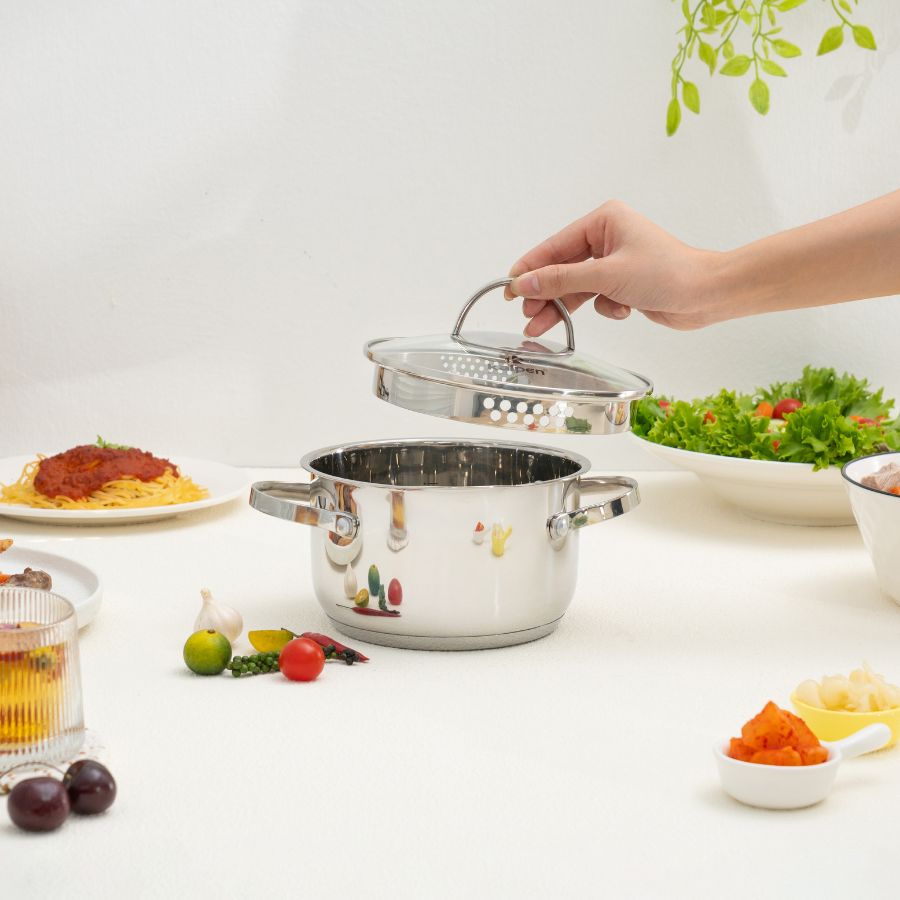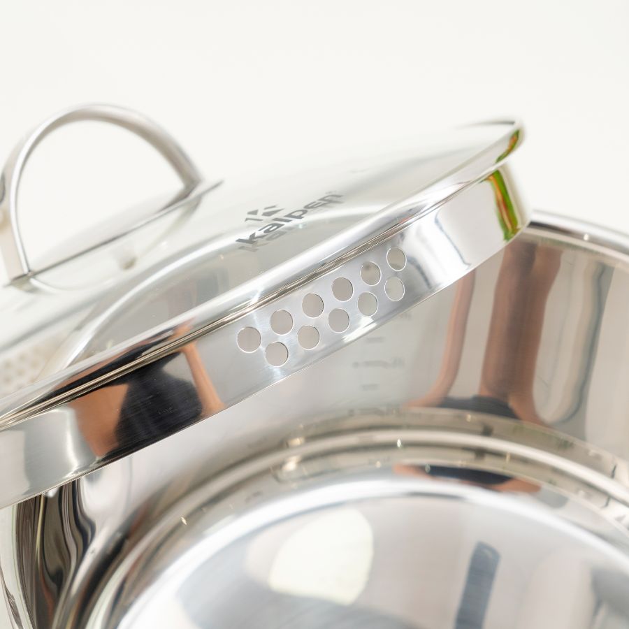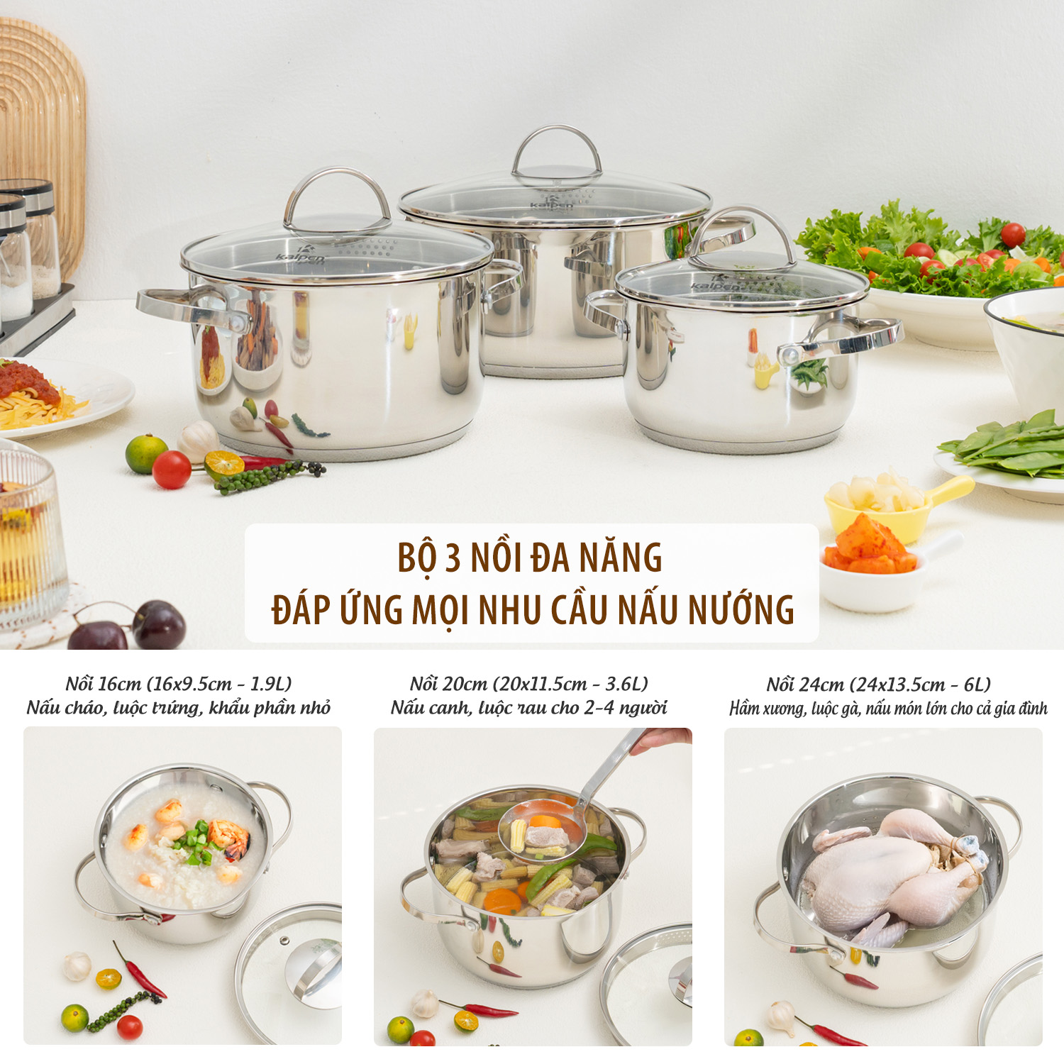 Bộ nồi inox Kalpen Lermat L1Pro gồm 3 kích thước tiêu chuẩn: 16cm, 20cm và 24cm, dễ dàng đáp ứng từ các món ăn đơn giản như nấu cháo, luộc rau cho đến những món cần dung tích lớn như hầm xương, nấu lẩu hay luộc gà nguyên con. Thiết kế chuẩn mực, tiện lợi giúp người nội trợ tiết kiệm thời gian và nhiên liệu mà vẫn đảm bảo món ăn thơm ngon, giữ trọn dinh dưỡng.