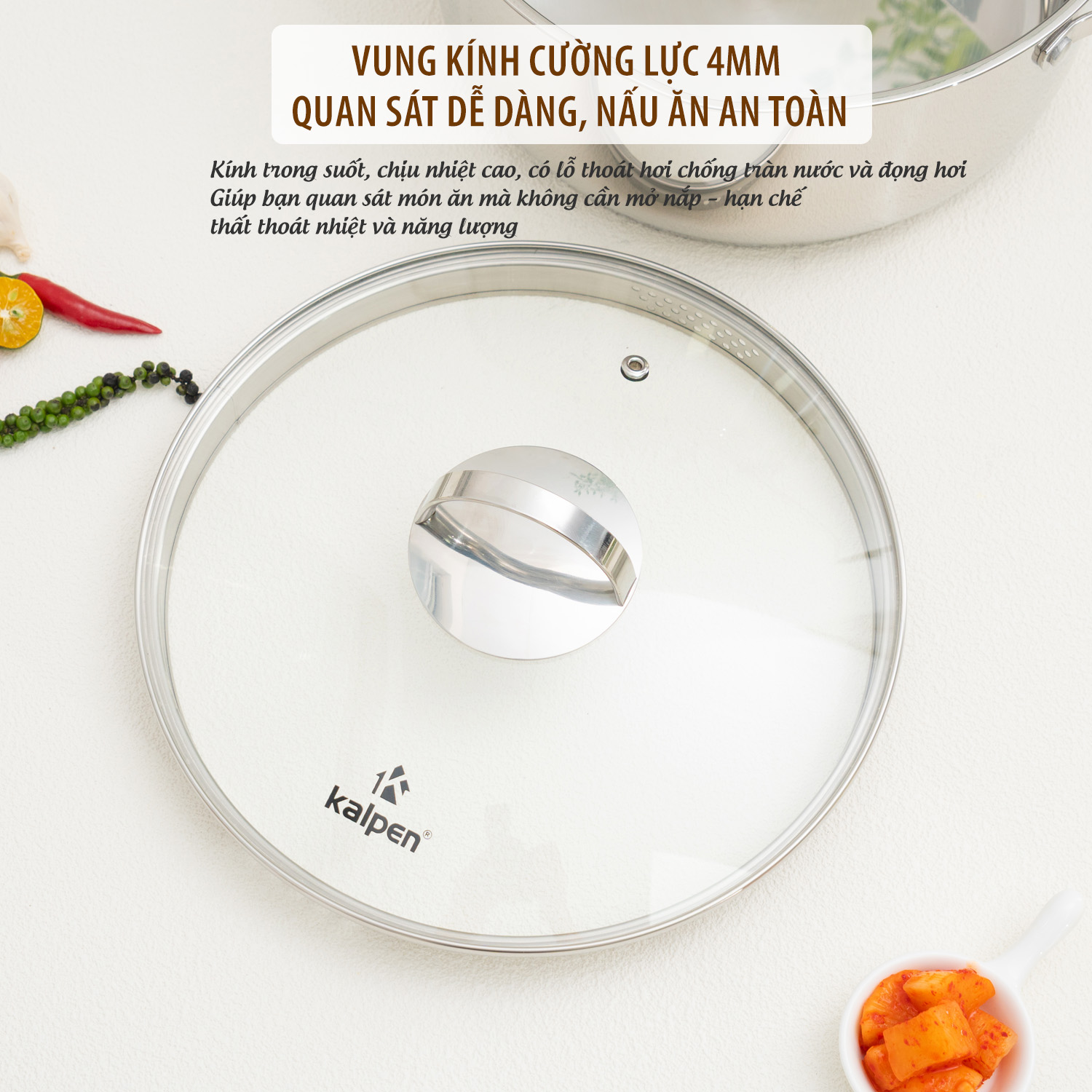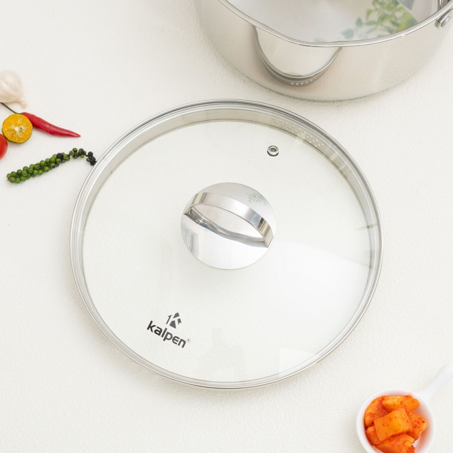 Vung nồi được làm từ kính cường lực dày 4mm, chịu nhiệt và chịu lực tốt, có lỗ thoát hơi chống đọng nước, tránh hiện tượng trào khi sôi. Nhờ nắp kính trong suốt, người dùng dễ dàng theo dõi món ăn đang nấu mà không cần mở nắp, tránh thất thoát nhiệt, tiết kiệm nhiên liệu và giữ nguyên hương vị món ăn.