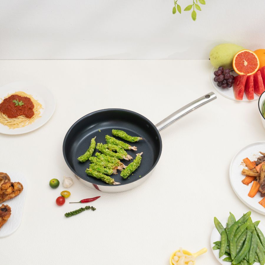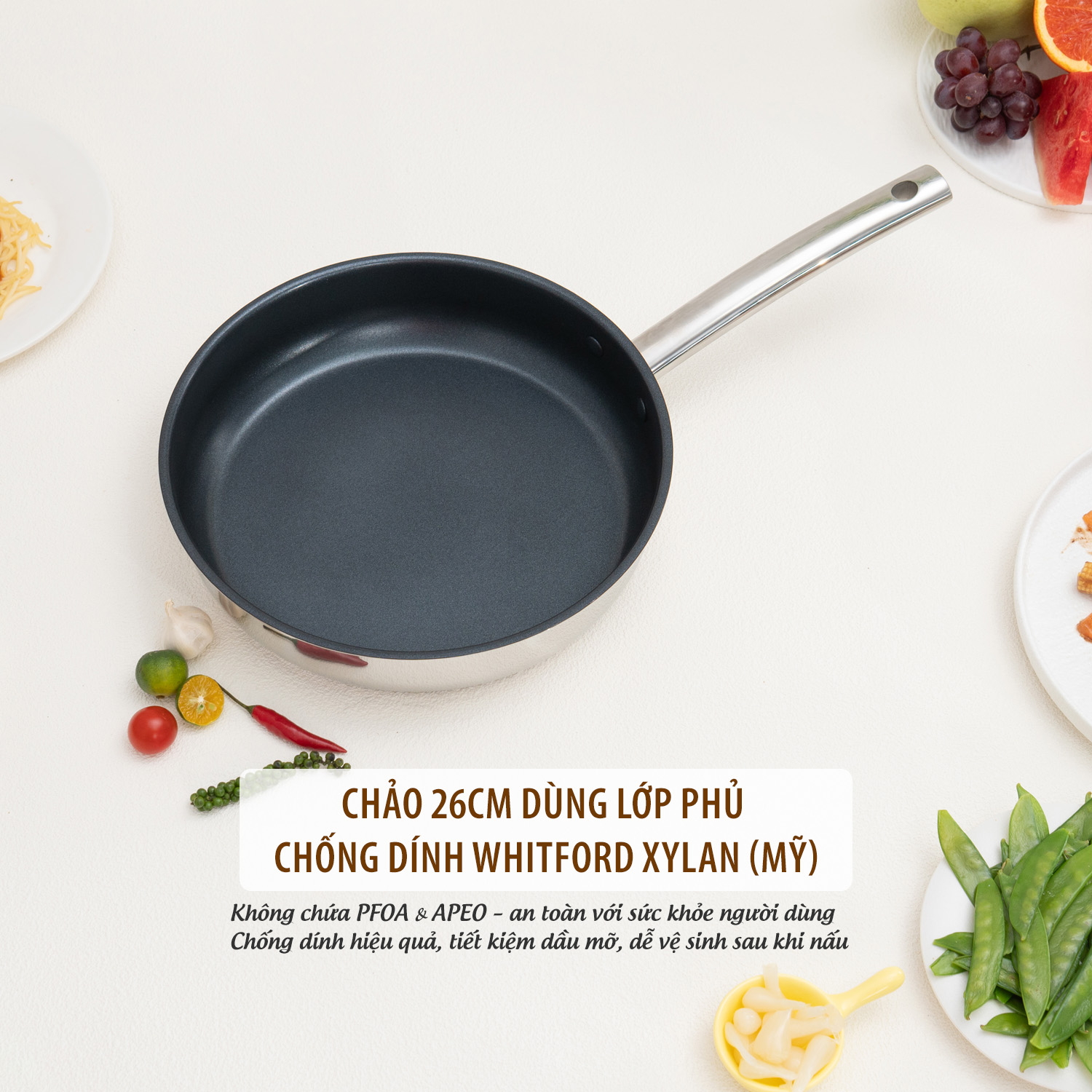 Chảo 26cm (26x6cm): Thiết kế lòng sâu, phủ chống dính cao cấp giúp chiên xào dễ dàng, không lo dính hay cháy khét.