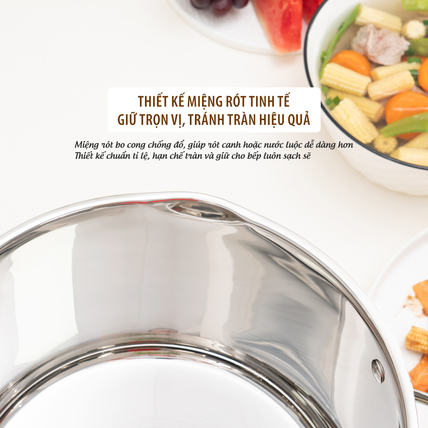 | Nồi 18cm | 18 x 10.5 cm | ~2.7 lít | Có | Inox cao cấp |