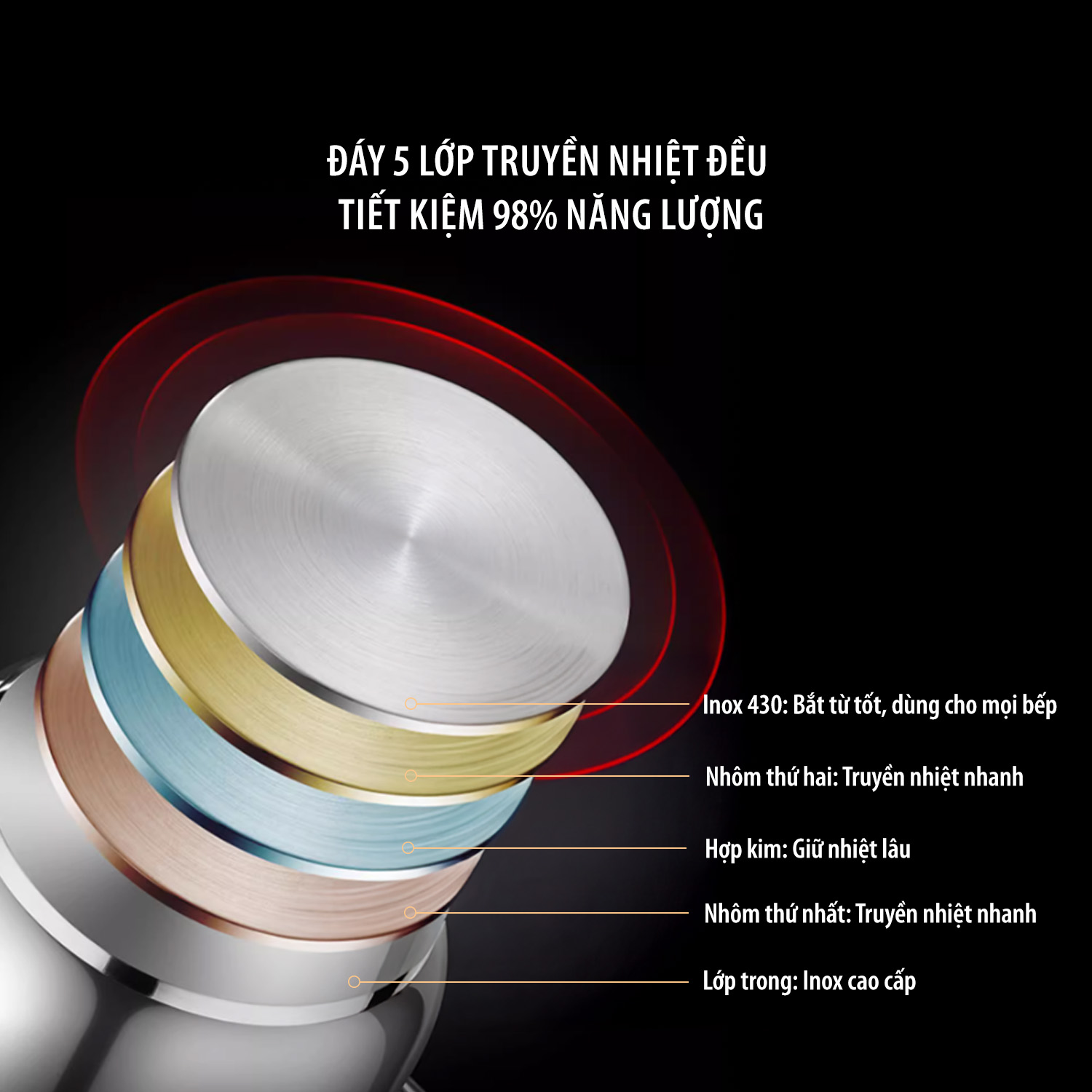 Lớp ngoài cùng là inox 430 bắt từ hiệu quả, giúp nồi tương thích với mọi loại bếp, đặc biệt là bếp từ hiện đại.