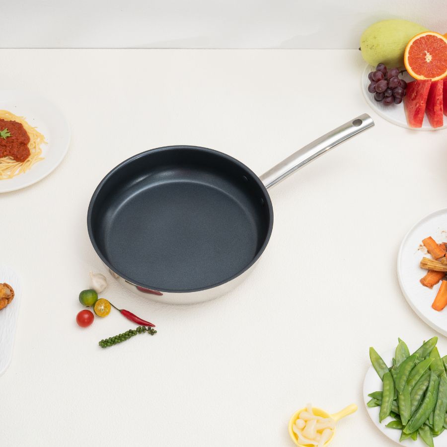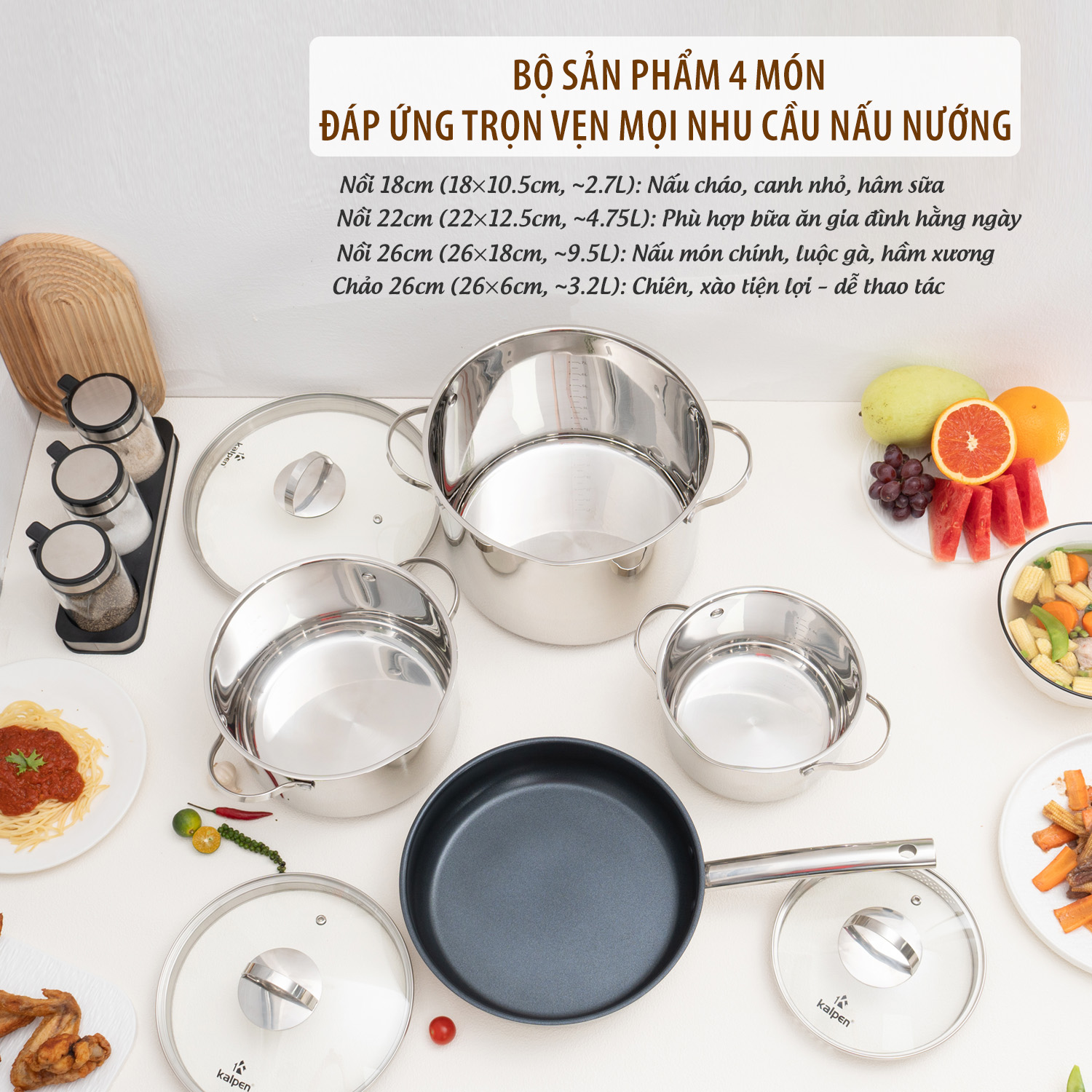 Bộ nồi inox 4 chiếc Kalpen Lermat L2Pro nổi bật với chiếc chảo chống dính cao cấp đường kính 26cm, được phủ lớp chống dính cao cấp – công nghệ chống dính hiện đại không chứa các chất độc hại như PFOA và APEO. Đây là tiêu chuẩn an toàn được các tổ chức quốc tế chứng nhận, giúp người dùng an tâm tuyệt đối khi chế biến các món chiên, xào hằng ngày.