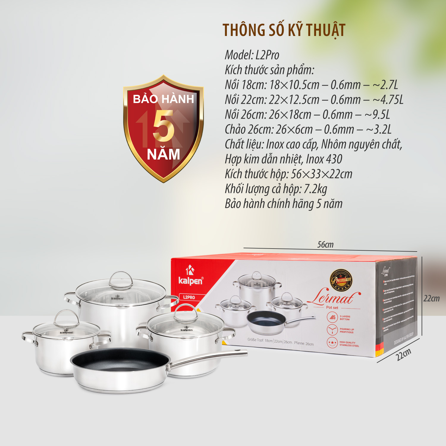 Bộ nồi inox 5 đáy Kalpen Lermat L2Pro không chỉ là một dụng cụ nấu ăn thông thường mà là một giải pháp toàn diện cho mọi căn bếp. Từ chất liệu inox cao cấp, công nghệ đáy 5 lớp đến thiết kế sang trọng và đa dạng kích thước, tất cả tạo nên một bộ sản phẩm xứng đáng có mặt trong mọi gia đình Việt hiện đại.