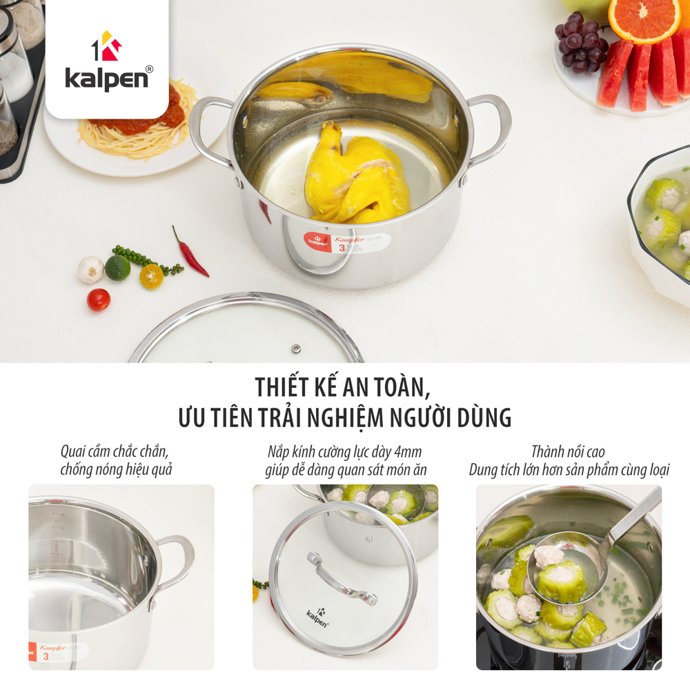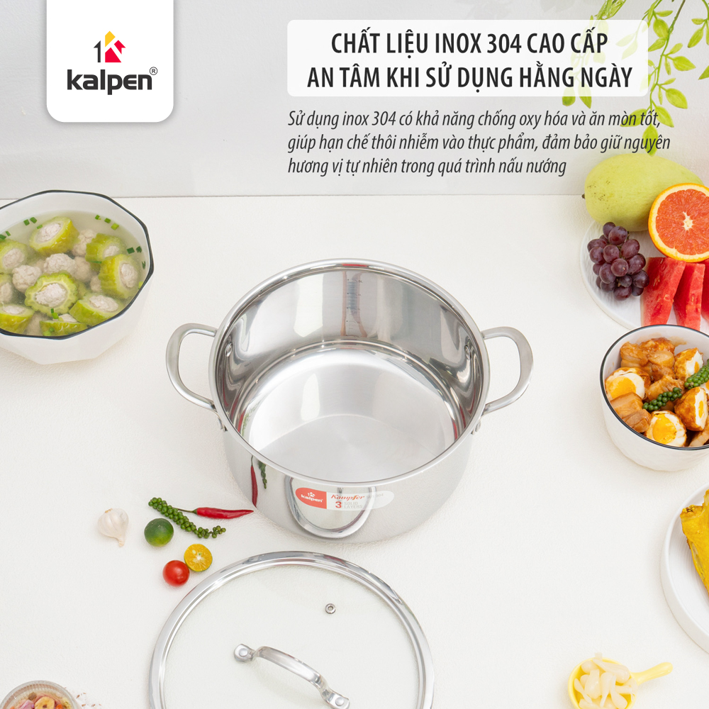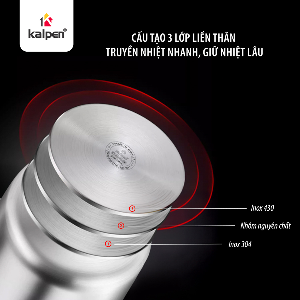 Sản phẩm được cấu tạo 3 lớp liền thân gồm lớp Inox 304 trong cùng tiếp xúc trực tiếp với thực phẩm, lớp nhôm dày ở giữa giúp phân bổ nhiệt nhanh và đều, lớp Inox 430 ngoài cùng tiếp xúc mặt bếp, mang lại hiệu suất nấu cao và tiết kiệm nhiên liệu.