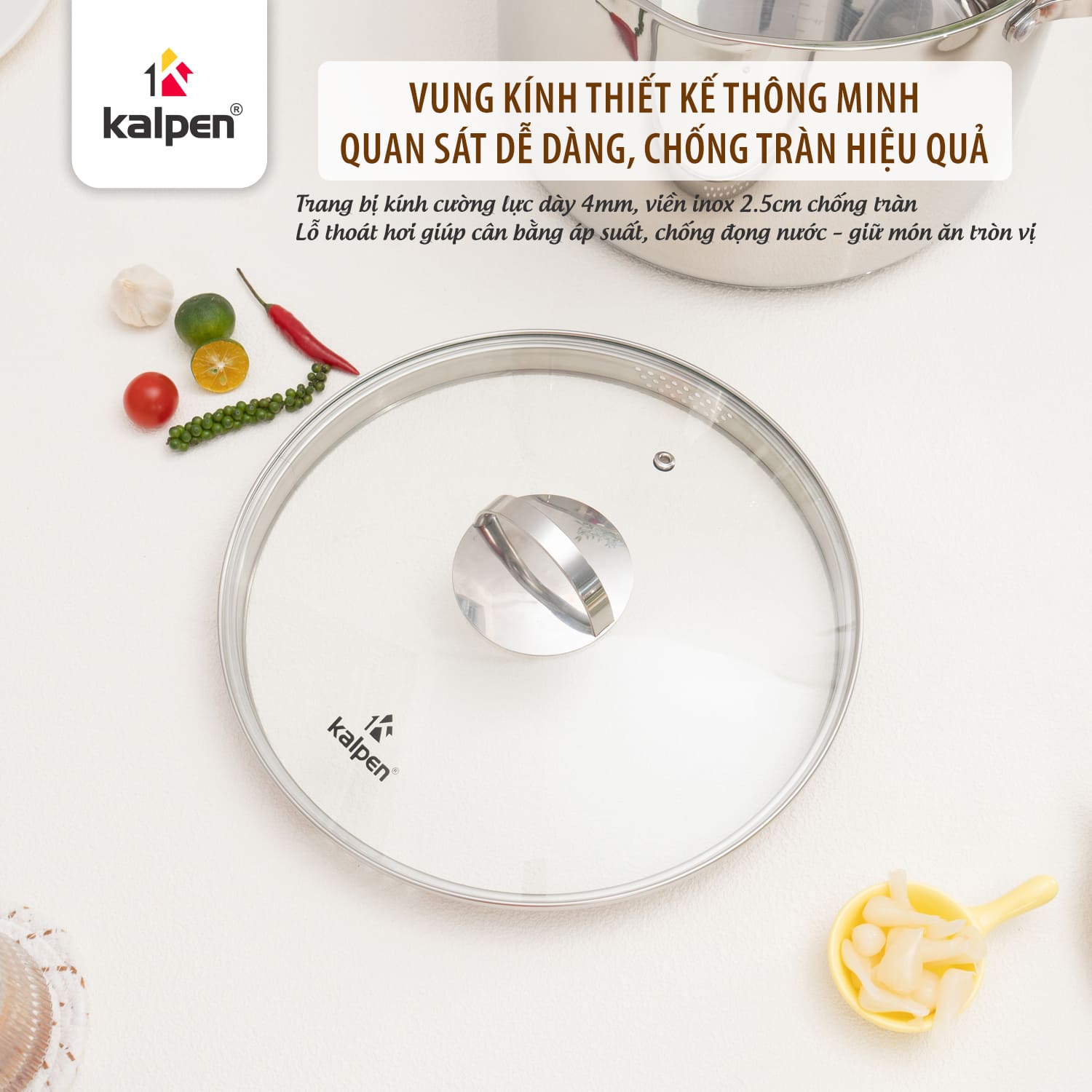 Trang bị vung kính trong suốt dày 4 mm, có lỗ thoát hơi chống đọng nước, giúp người dùng dễ dàng theo dõi món ăn trong quá trình nấu mà không cần mở nắp.