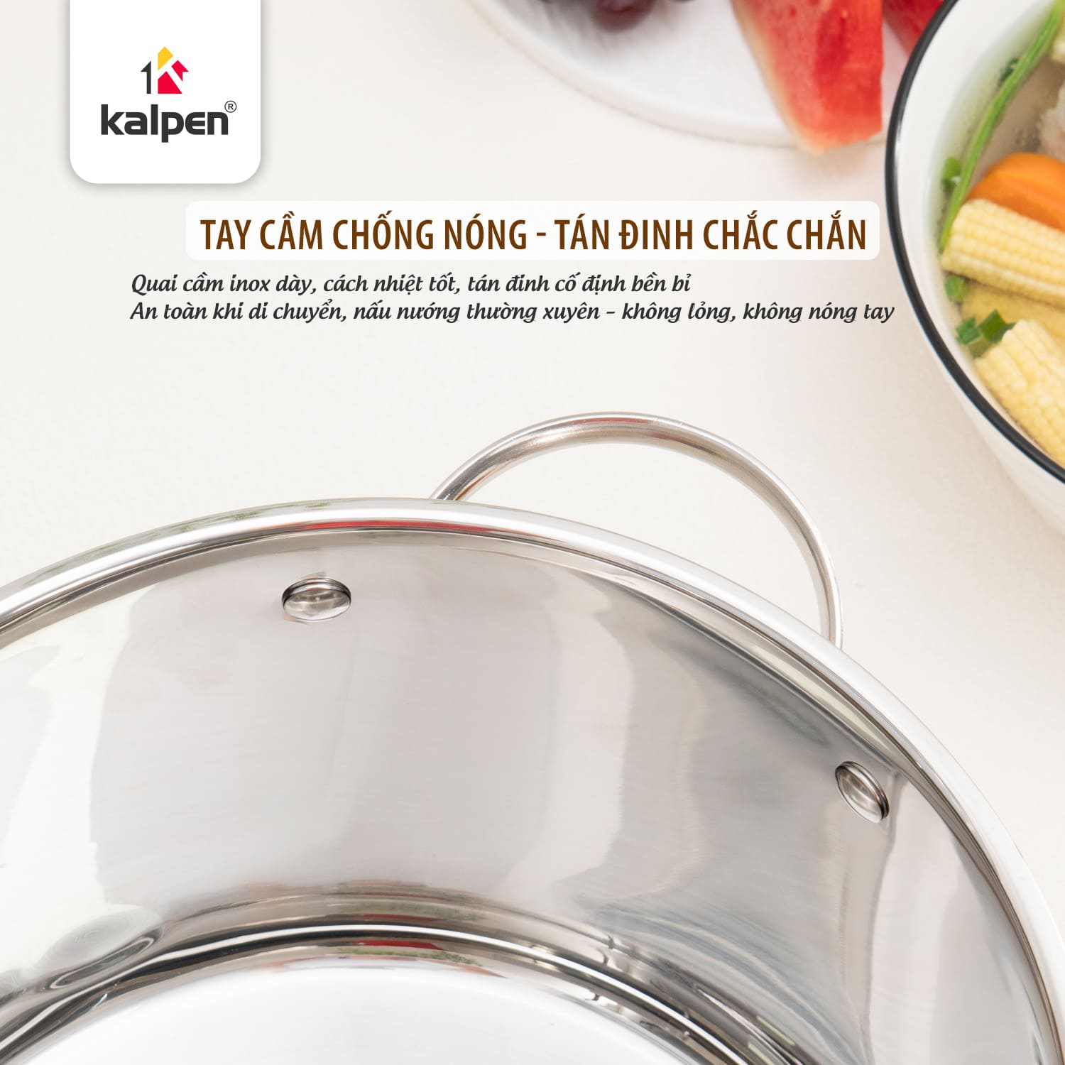 Tay cầm bằng Inox dày, đinh tán cố định chắc chắn, không lỏng lẻo, không nóng tay khi sử dụng, đảm bảo độ bền và an toàn trong suốt quá trình nấu nướng.