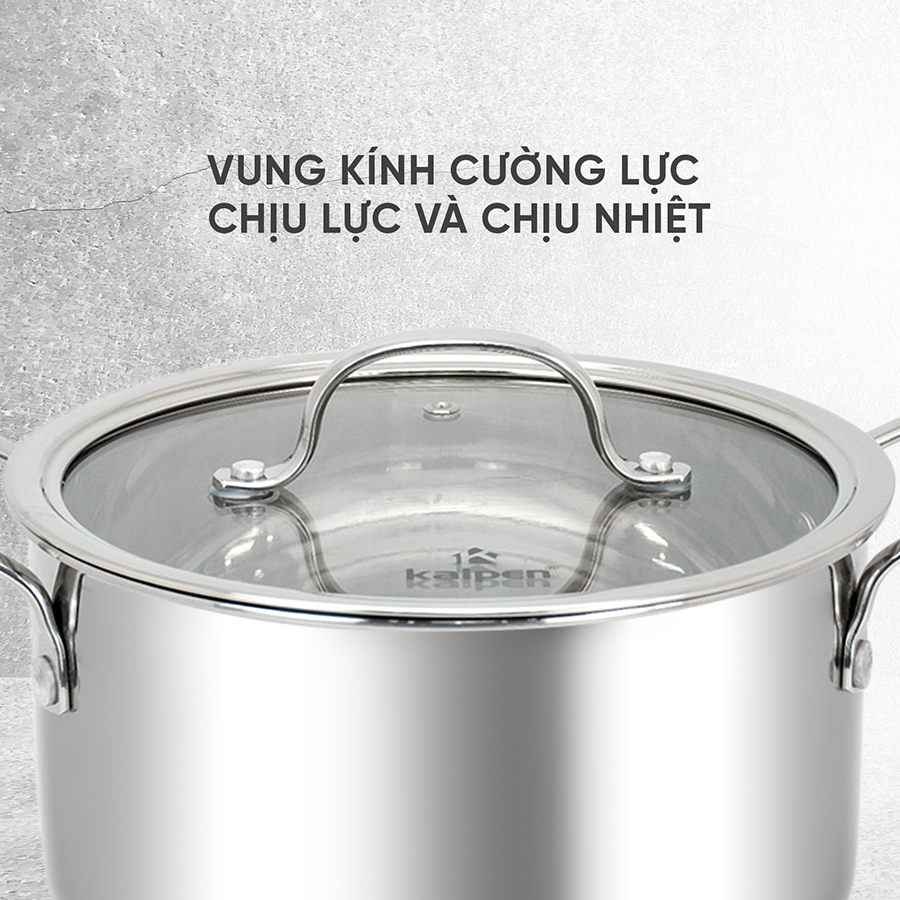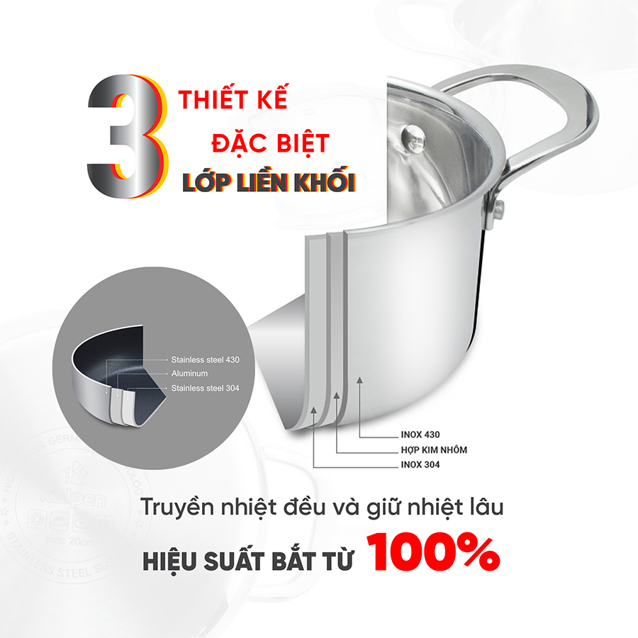 Nồi chảo bộ sản phẩm Kalpen Kampfer KF2 có cấu tạo 3 lớp liền thân dày dặn và chắc chắn. Lớp trong cùng tiếp xúc với thực phẩm là inox cao cấp. Ở giữa là lớp nhôm giúp truyền nhiệt nhanh, tỏa nhiệt đều. Ngoài cùng tiếp xúc với mặt bếp là inox 430 – đây là dòng inox có khả năng bắt nhiệt cưc tốt đặc biệt là đun nấu trên bếp từ.