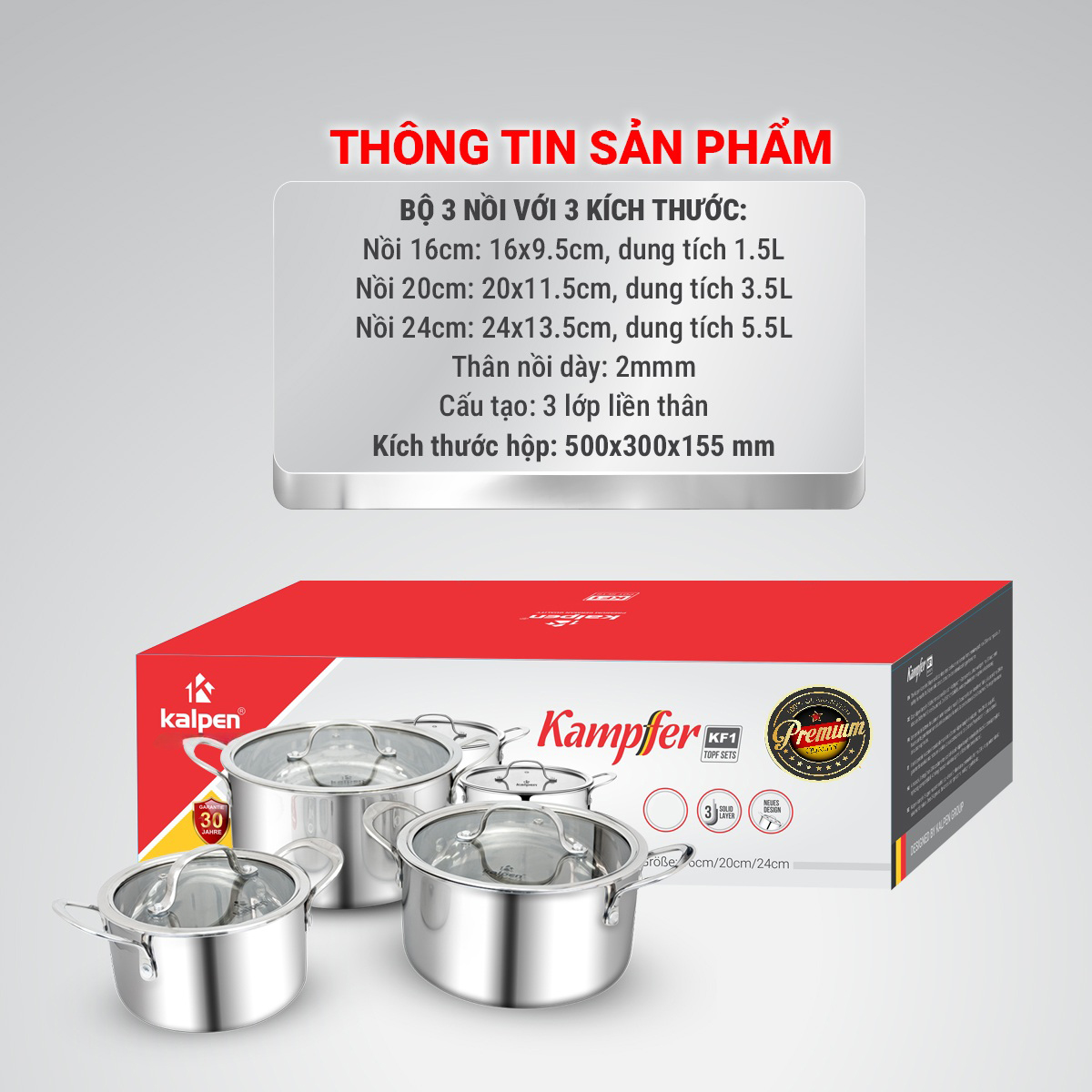 Bộ nồi inox 3 lớp liền khối Kalpen Kampfer gồm 3 nồi với 3 kích thước thông dụng 16cm, 20cm và 24cm đáp ứng được tối đa nhu cầu nấu nướng của gia đình từ 4-6 người.