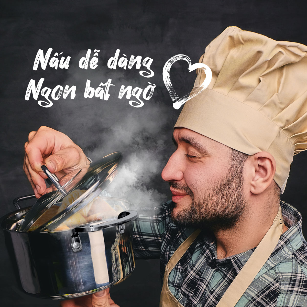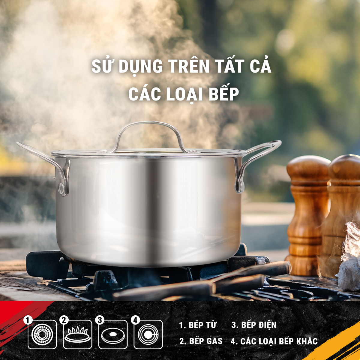 Vung nồi được làm từ kính cường lực trong suốt dày 4mm người dùng dễ dàng quan sát thực phẩm bên trong. Vung thiết kế phẳng, chống dồn hơi ra mép và có lỗ thông hơi chống trào hiệu quả.