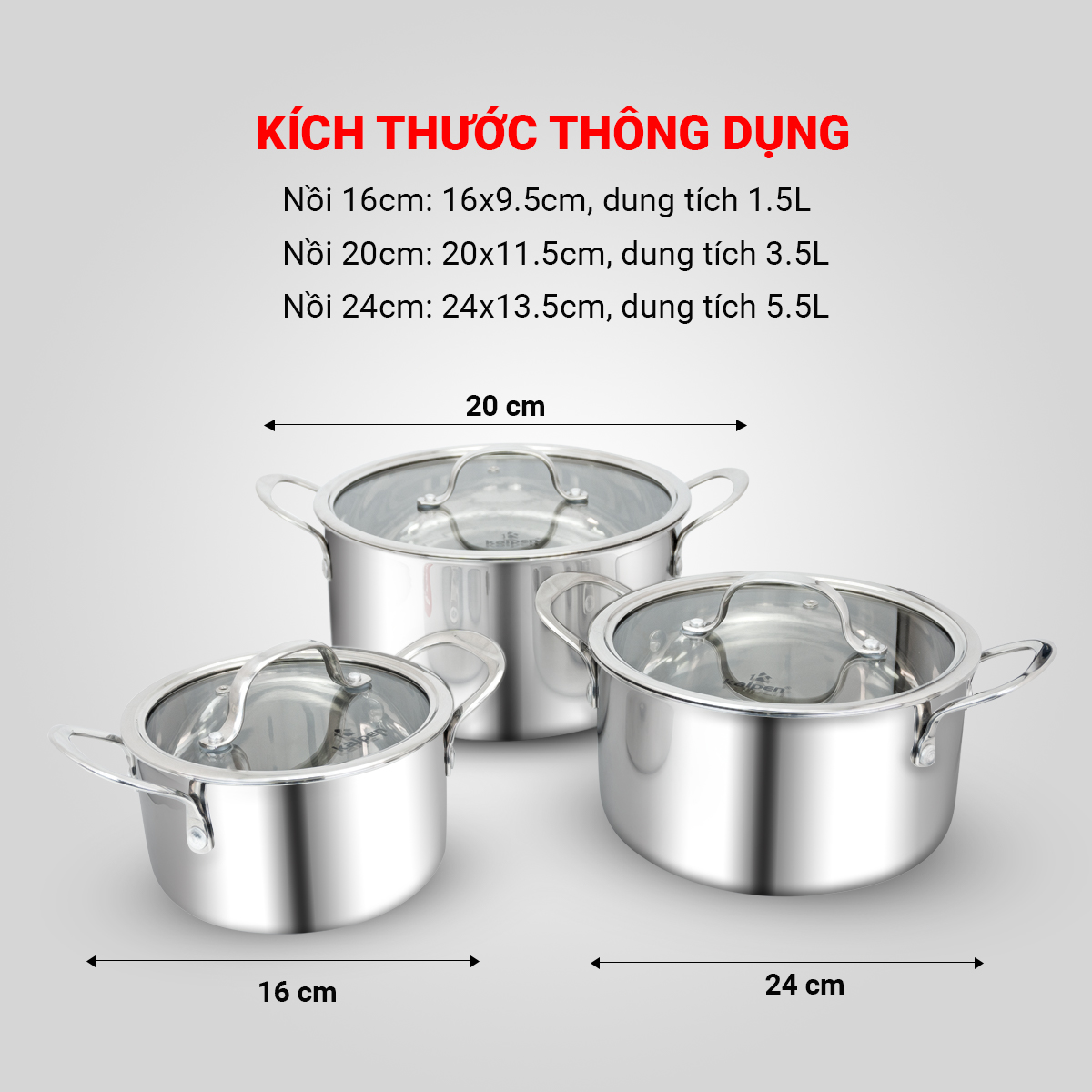 Nồi 16cm: 16x9.5cm, dung tích 1.5L