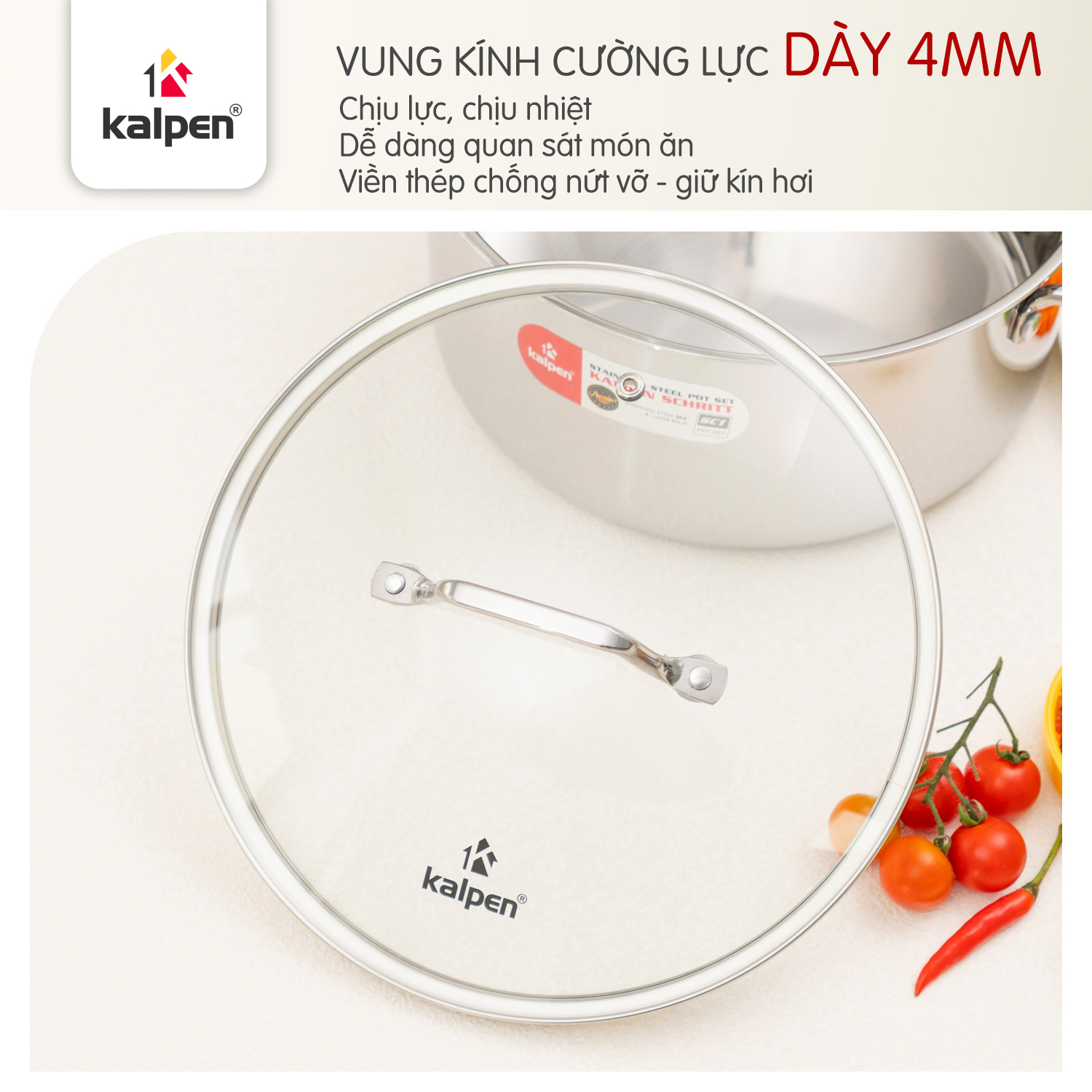 Vung kính cường lực G-shape của Kalpen Schritt SC1 dày 4 mm, không chỉ chịu nhiệt tốt và chống va đập, vung còn được viền thép không gỉ tinh tế giúp tăng độ bền và hạn chế vỡ nứt trong quá trình sử dụng.