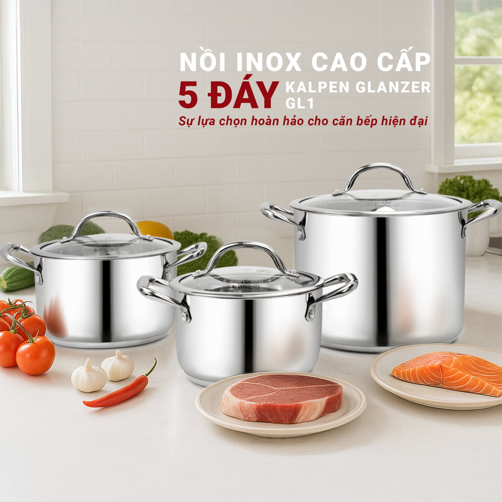 Với cấu tạo 5 lớp này, bộ nồi inox cao cấp Kalpen Glanzer GL1 không chỉ giúp nấu nhanh hơn, tiết kiệm gas, điện, mà còn duy trì nhiệt độ ổn định, lý tưởng cho các món hầm, kho hay ninh nhừ.