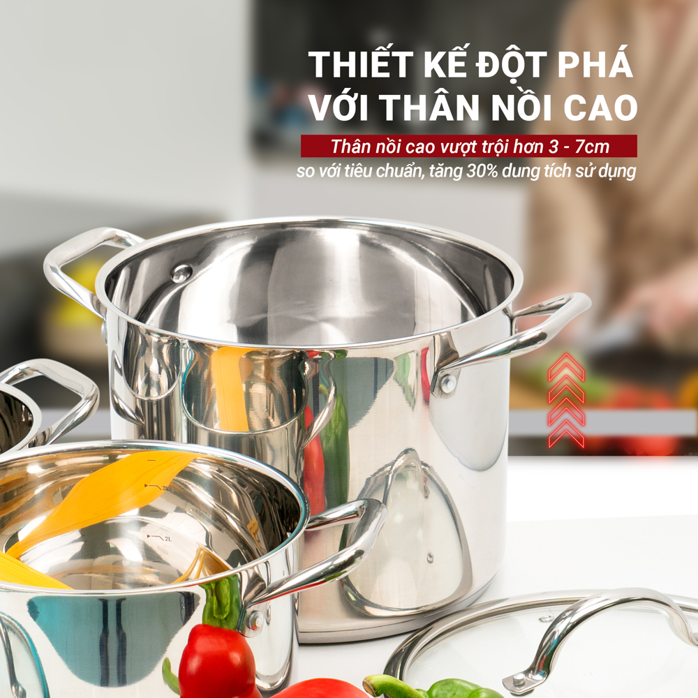 Nồi 24cm cao hơn đến 7cm, giúp tăng dung tích thực tế và tránh trào khi nấu.